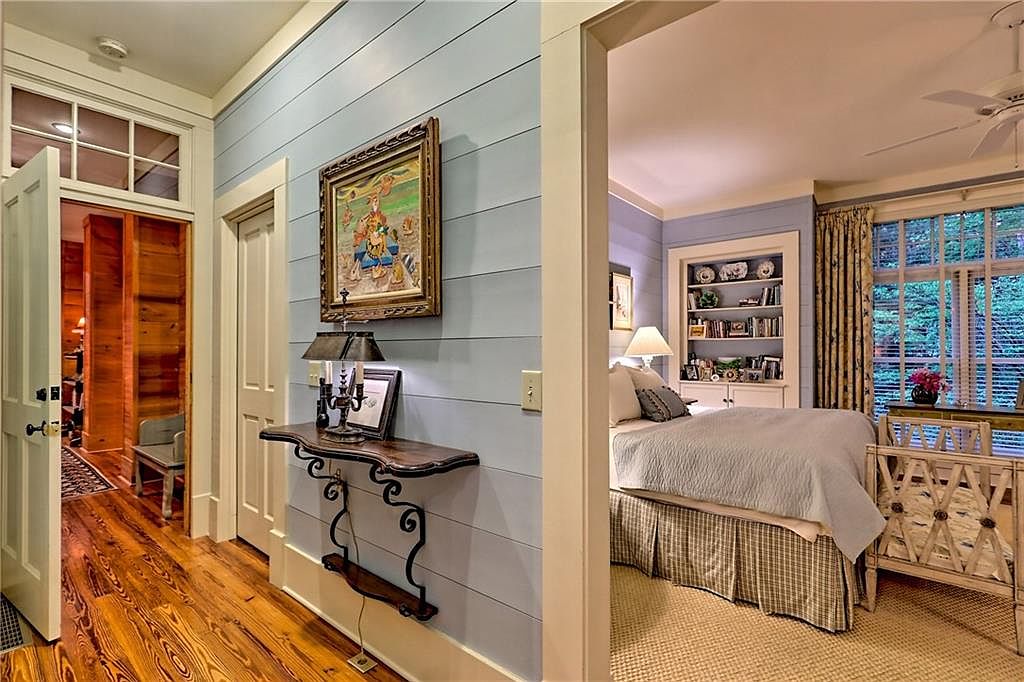 Soft blue shiplap walls define this cozy transitional space leading into a charming bedroom. The warm, polished wooden floor contrasts with the muted blue and cream palette, lending a rustic yet refined atmosphere. A slender console table with ornate wrought iron legs anchors the hallway, displaying a classic lamp and framed art beneath a colorful, framed painting. The bedroom beyond features a comfortable bed with a white quilt and checkered skirt, flanked by lamps that cast a warm glow. Built-in shelves filled with books and decor, alongside large windows framed by patterned curtains, add to the inviting, lived-in feeling.