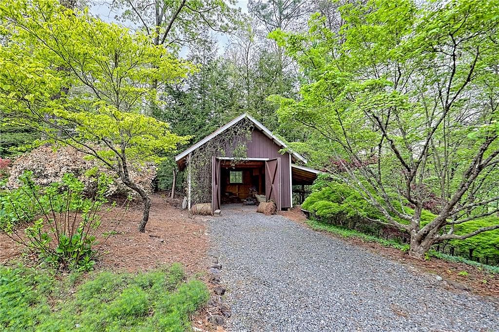 This charming detached garage is nestled comfortably in a lush, wooded setting, surrounded by a variety of mature trees and vibrant greenery. The structure features a rustic, barn-style design with vertical wood siding painted in a deep, understated taupe, complemented by a steeply pitched roof edged in white trim. The driveway leading to the garage is made of loose gravel, bordered by natural stone, which enhances the rustic, countryside feel. Open double doors invite a glimpse inside, hinting at functional storage space and a peaceful retreat amidst the verdant landscape. The overall ambiance blends practicality with tranquility, perfectly suited for a nature-inspired home.