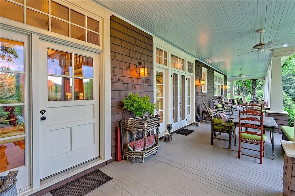 This spacious front porch exudes a charming, rustic elegance with its dark brown shingle siding contrasting beautifully against the crisp white trim and door frames. The door features classic divided glass panels and a transom window above, enhancing the natural light. The ceiling is painted a soft, inviting seafoam green with ceiling fans that add functionality and comfort. The seating area consists of wooden chairs and a long, sturdy table with green cushions, creating a cozy space for gatherings. Warm wall-mounted lanterns and potted greenery add welcoming touches. The layout invites relaxation while enjoying the lush outdoor surroundings.