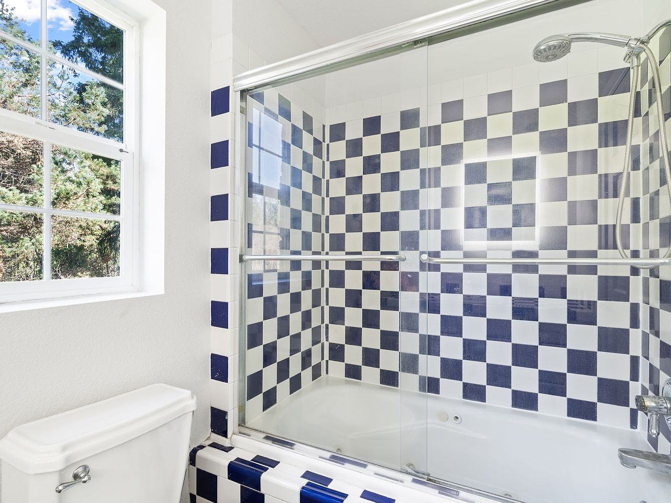 This bathroom shower area features a bathtub enclosed with clear glass sliding doors, framed in sleek metal. The walls surrounding the tub are adorned with a bold navy and white checkerboard tile pattern, creating a vibrant and classic contrast against the bright white walls. The showerhead is mounted on the right with a flexible hose attachment. Natural light floods the space through a nearby grid-pane window, highlighting the clean lines and modern yet timeless design. The overall aesthetic is fresh, crisp, and functional, combining traditional tile work with contemporary fixtures and ample daylight.