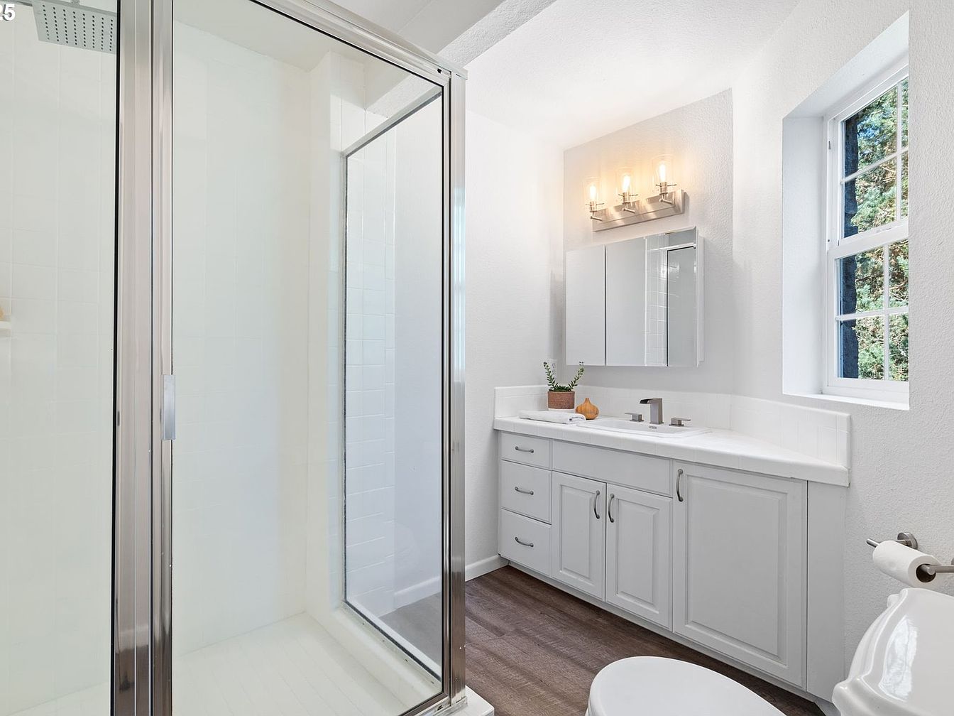 This bathroom features a clean and bright design with a predominantly white color scheme, creating an inviting and fresh atmosphere. A white vanity with classic paneled cabinet doors and silver handles spans the length of the wall, topped with a smooth white countertop. Above the vanity, a mirrored medicine cabinet provides practical storage, complemented by a modern three-light fixture casting warm illumination. To the left, a glass-enclosed shower with sleek, silver framing offers a minimalist and functional bathing space. Wood-like flooring adds warmth and contrast to the crisp white walls and fixtures, blending contemporary and traditional elements.