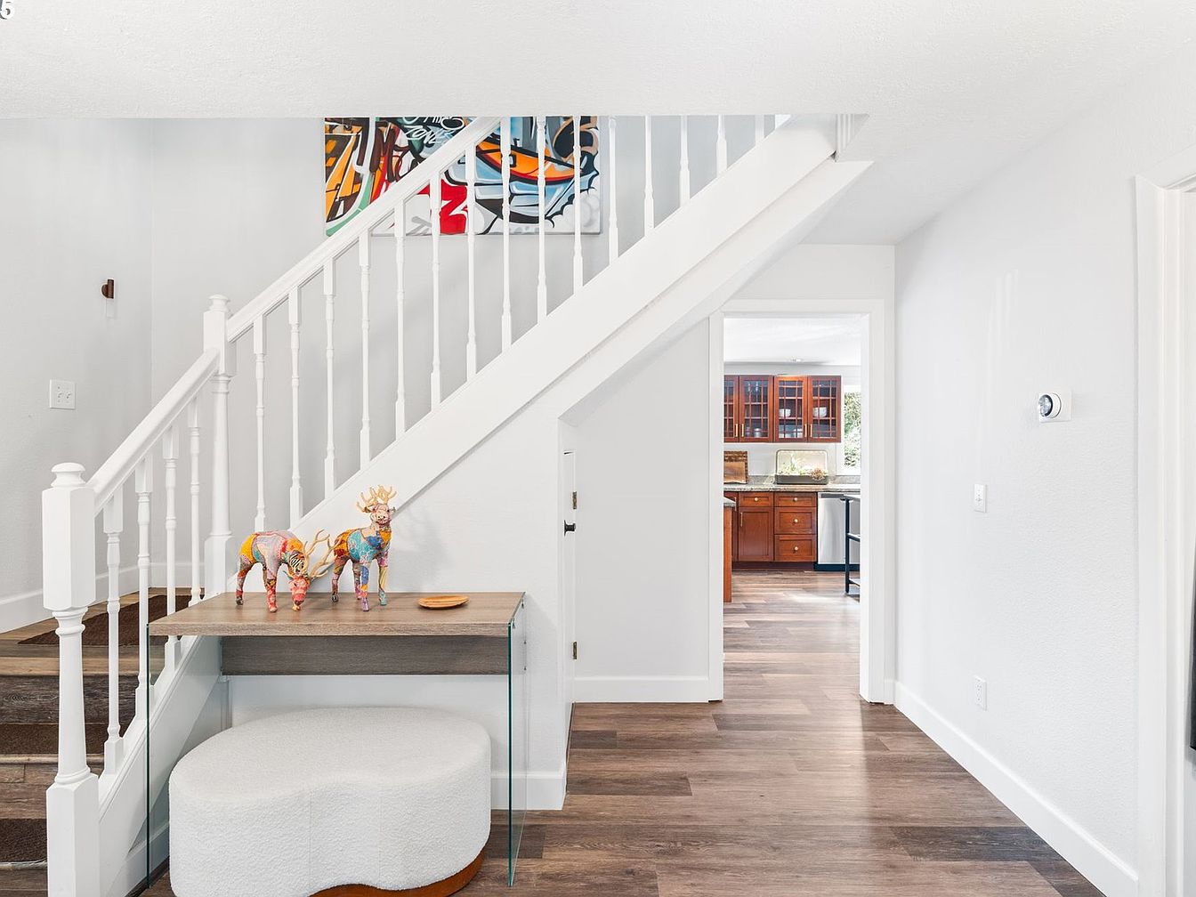 This entryway features a crisp, clean design with white walls and a white wooden staircase that adds a touch of classic charm. The staircase’s spindles are evenly spaced, leading the eye upward where a colorful, modern art piece injects vibrancy. Underneath the stairs, a sleek glass and wood console table holds two brightly painted animal sculptures, contributing artistic flair. A soft, rounded white ottoman sits beneath the table, offering both texture and function. Light wood floors extend through the space, seamlessly connecting the entryway to a warm-toned kitchen visible through the doorway, creating a welcoming flow.