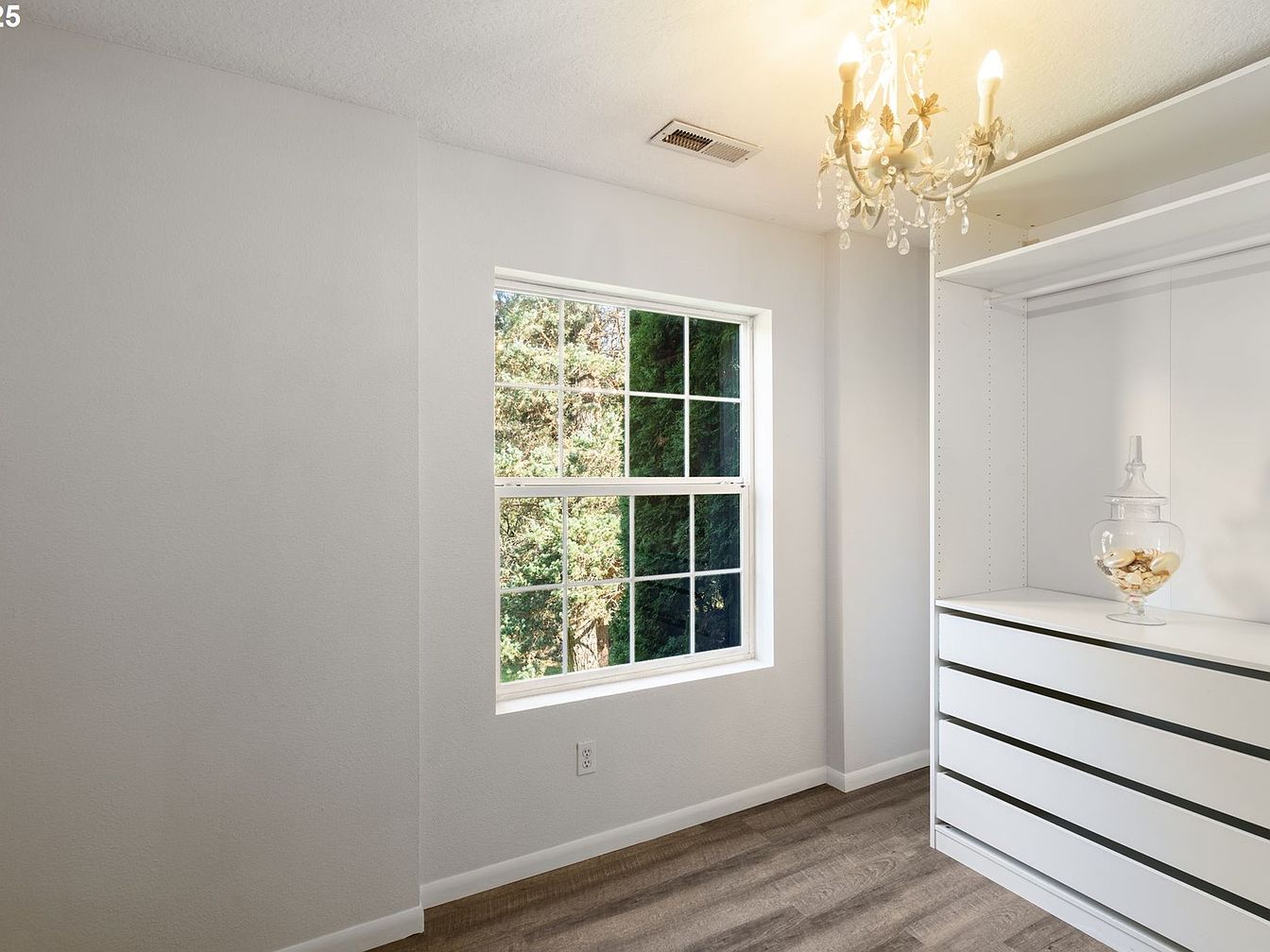 This compact walk-in closet presents a clean, minimalistic design with white walls and cabinetry that create a bright and airy atmosphere. The built-in storage unit features sleek, modern drawers and an open shelving section, perfect for organizing clothing and accessories. A small chandelier adds a touch of elegance and warmth to the space. Natural light streams in through a sizable window with divided panes, overlooking lush greenery outside, which contrasts softly against the neutral tones of the room. The wood-toned flooring grounds the space with subtle texture and warmth.