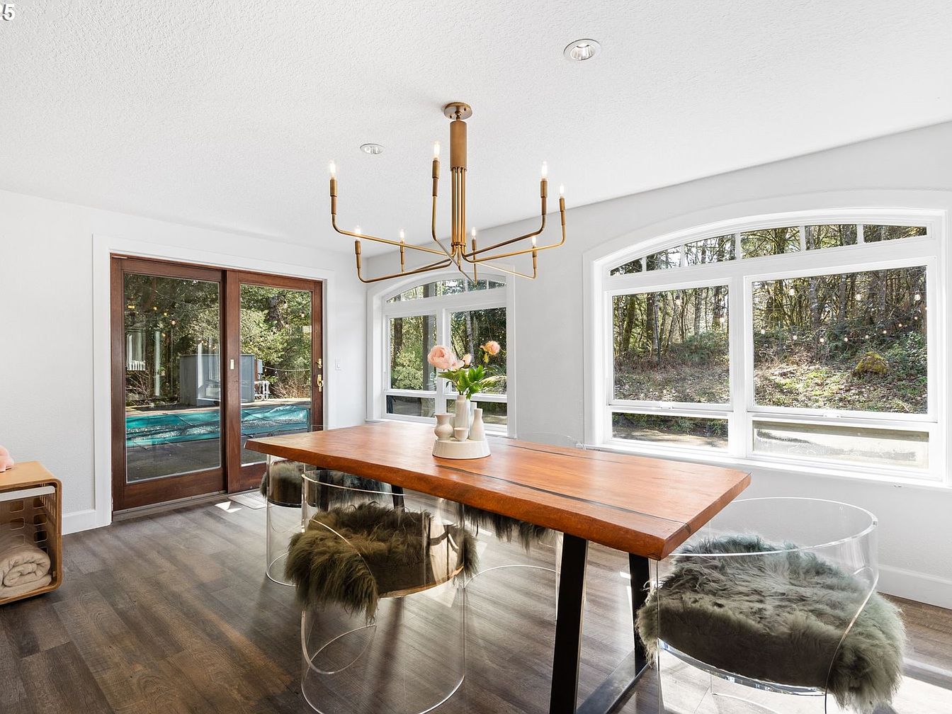 This bright dining area combines modern simplicity with natural warmth, featuring a solid wood table with a live edge that anchors the space. Surrounding the table are clear acrylic chairs adorned with cozy fur cushions, adding texture and a touch of rustic comfort. The room is bathed in natural light from a large, arched window and glass double doors framed with dark wood, which open to an outdoor area. A sleek, geometric brass chandelier hangs overhead, contrasting tastefully with the white walls and ceiling, while the woodgrain flooring grounds the design with earthy tones.
