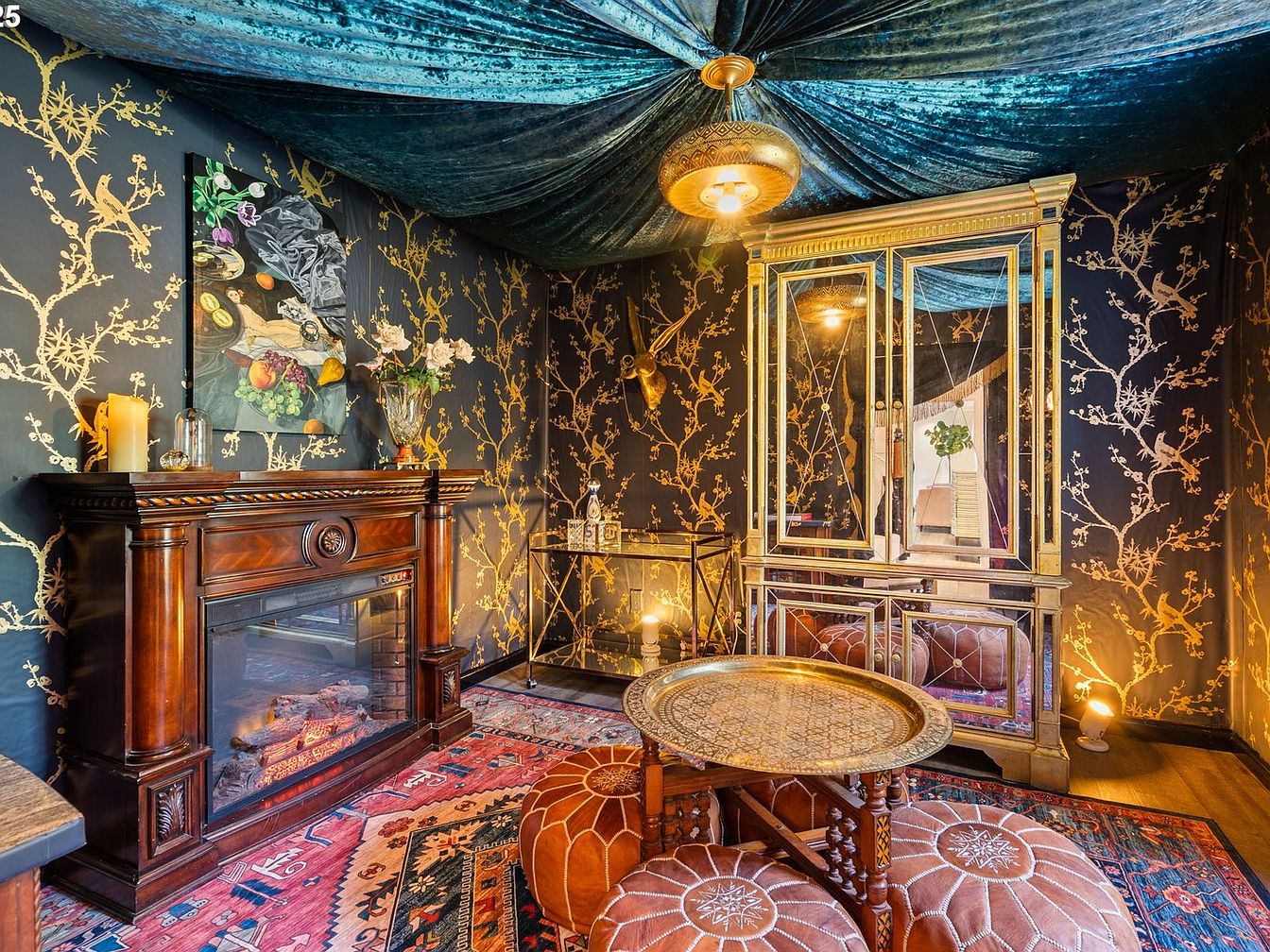 This intimate sitting area features a rich dark blue and gold floral wallpaper that beautifully contrasts with the warm wooden fireplace mantel. The ceiling is draped with a luxurious teal velvet fabric, creating a tent-like cozy ambiance around an ornate gold pendant light. A large mirrored cabinet with gold trim adds depth and elegance, reflecting the room’s warm lighting. The seating consists of comfortable round leather poufs clustered around a carved wooden table with an intricate metal top. A patterned oriental rug anchors the space, blending deep reds with soft pinks and blues for a warm, inviting vibe.