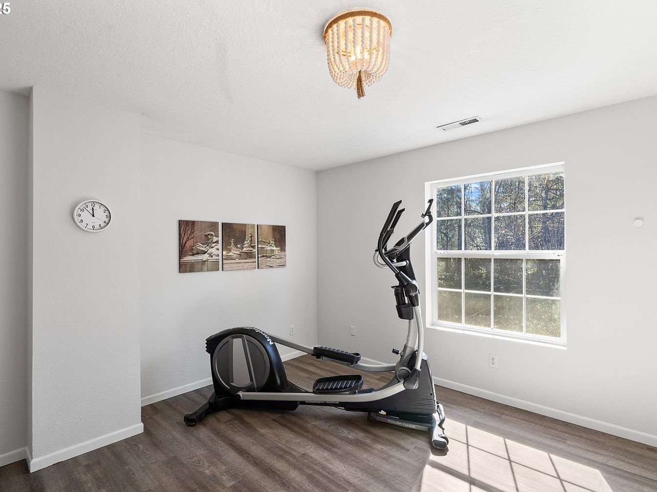 This compact exercise space features a sleek elliptical machine positioned near a large window, allowing ample natural light to brighten the room. The clean white walls and ceiling enhance the airy feel, while the wood-look laminate flooring adds warmth and texture. A simple wall clock and a three-panel art piece depicting a serene fountain provide understated decorative touches, balancing functionality with peaceful aesthetics. The ceiling light fixture presents a subtle boho charm with its bead design. Overall, it’s a minimalist, inviting corner tailored for focused workouts and rejuvenation within the home.