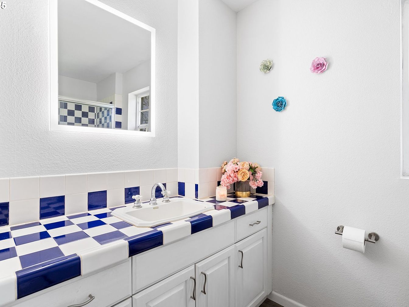 This bathroom features a charming vanity with a blue-and-white checkerboard tile countertop and backsplash, lending a playful yet classic vibe. The white cabinetry below offers ample storage and contrasts nicely with the vibrant tiles. A modern square mirror with integrated backlighting hangs above the sink, providing bright illumination and enhancing the room’s clean aesthetic. The walls are painted a soft white, accentuated by colorful decorative flower wall accents adding a subtle touch of whimsy. A bouquet of pink and beige flowers sits gracefully on the countertop beside a lit candle, creating a fresh and inviting atmosphere. A stainless steel toilet paper holder is mounted neatly on the adjacent wall.