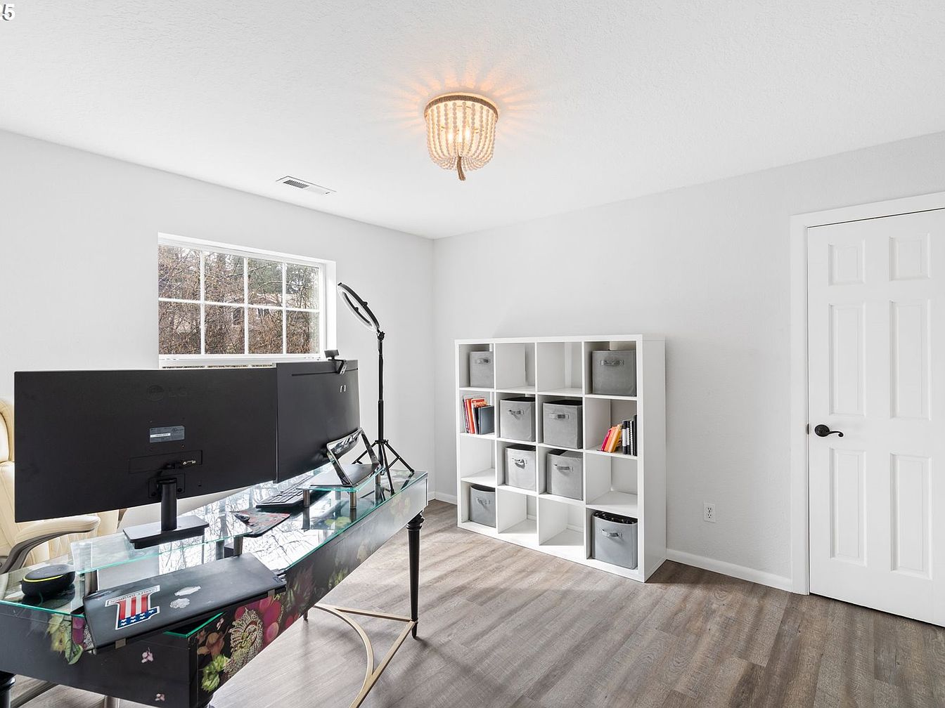 This bright and airy home office features a minimalist design with white walls and wood-toned flooring that adds warmth to the space. A contemporary glass desk with black legs and a subtle floral pattern on the front serves as the focal point, supporting dual monitors and a few desk essentials, blending modern tech with artistic flair. A white cubed shelving unit against one wall offers organized storage, housing grey fabric bins and selected books. Natural light streams in through a large window, enhancing the clean, streamlined look, while a beaded chandelier overhead provides an elegant touch to the functional room.