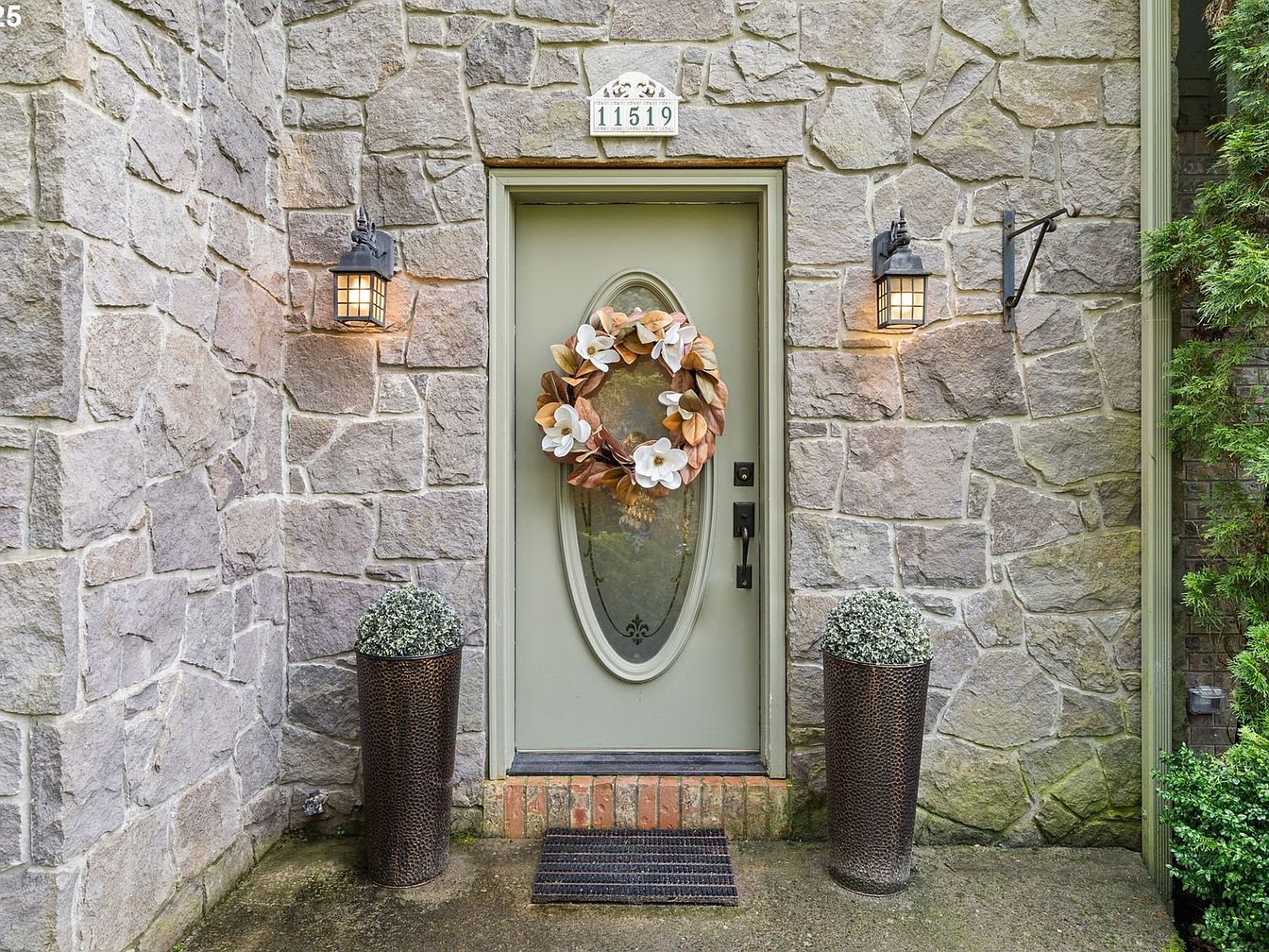 This charming front door entrance features a muted sage green door set within a rustic stone exterior wall. The door has an oval glass inset adorned with a decorative wreath composed of soft brown and white magnolia flowers, adding a welcoming touch. Flanked on either side by tall, textured bronze planters holding neatly trimmed greenery, the doorstep is inviting and thoughtfully styled. Two black metal lantern-style sconces emit a warm glow, enhancing the natural stone’s earth tones. The concrete entryway is simple, with a dark doormat providing contrast and functionality, completing the cozy yet elegant entry aesthetic.