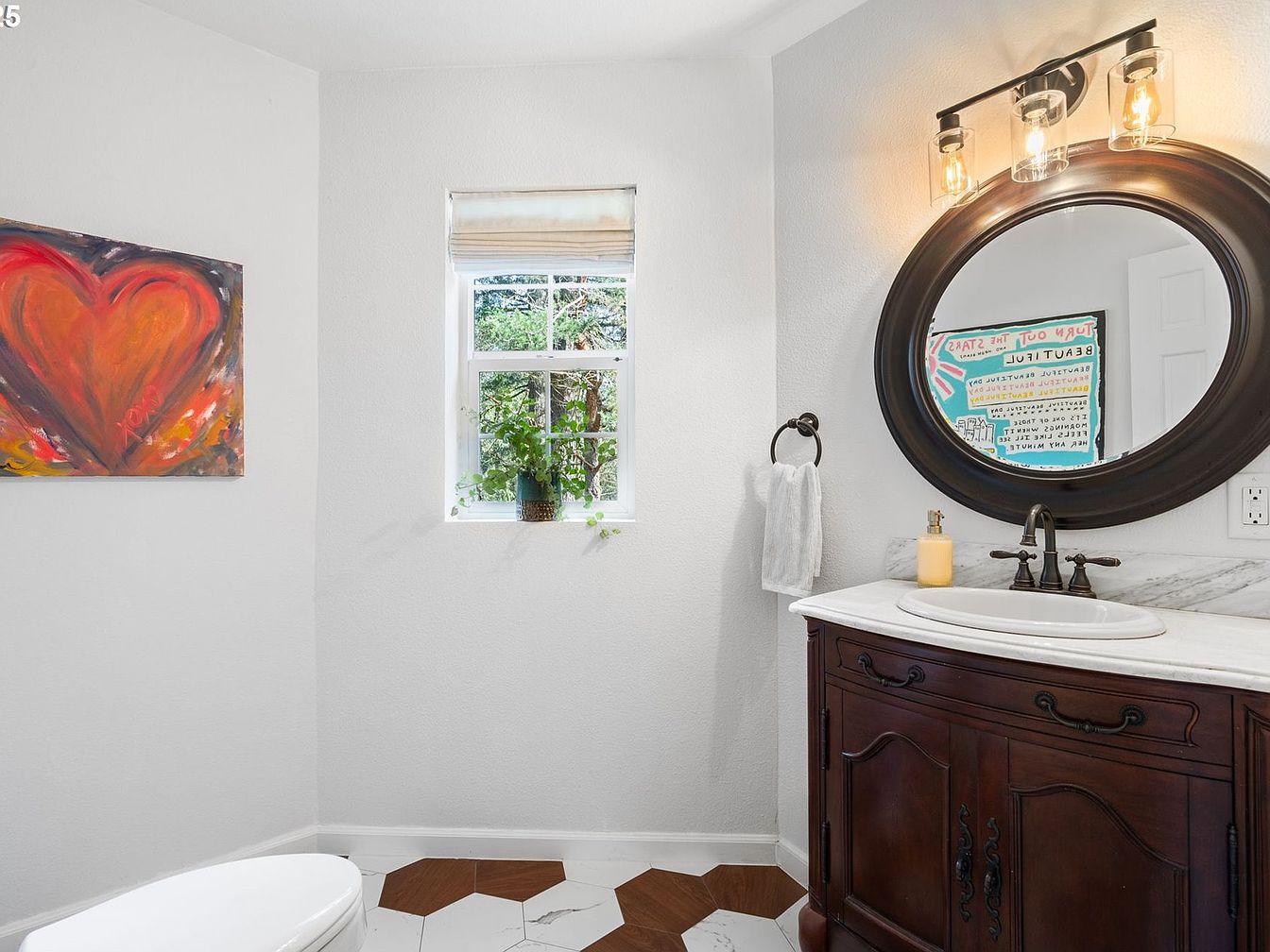 This bathroom section features a classic wooden vanity with intricate detailing and a polished white marble countertop. Above sits a large, oval mirror framed in dark wood, paired with a three-light fixture that emits a warm, inviting glow. The walls are painted a crisp white, enhancing the room’s brightness and clean look. The floor stands out with an elegant mix of hexagonal tiles in white marble and rich brown wood tones, establishing a striking geometric pattern. A small window with a white roman shade brings natural light and a touch of greenery, adding freshness. An abstract heart artwork introduces a pop of vibrant color, balancing traditional and contemporary design elements.