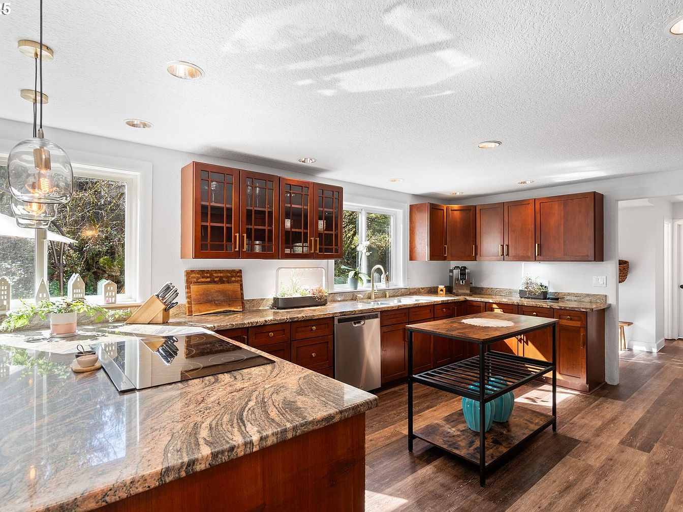 This kitchen presents a bright and airy atmosphere, highlighted by large windows that invite natural light, amplifying the warm wood tones of the cabinetry. The rich cherry wood cabinets, both upper and lower, feature brass handles that add a subtle touch of elegance. Granite countertops with fluid, natural patterns stretch along the perimeter, complementing the wood with earthy hues. A small, mobile island with a black metal frame and wooden surface stands in the center, offering added prep space and storage. The floor is covered in wood-look planks, merging warmth with durability. Recessed ceiling lights and pendant lighting near the window enhance the inviting ambiance while maintaining a clean, uncluttered look.