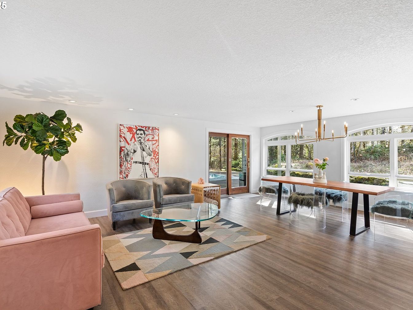 This combined living and dining space features an open layout with ample natural light streaming through large arched windows and glass doors that lead outdoors. The area uses a soft, neutral color palette with white walls and light wood flooring, creating an airy, inviting atmosphere. Furnishings include a muted pink velvet sofa paired with two plush gray chairs centered around a glass coffee table on a geometric patterned rug. The dining side showcases a long wooden table supported by black metal legs, surrounded by transparent chairs with cozy faux fur cushions, under a modern gold chandelier, blending mid-century and contemporary aesthetics.