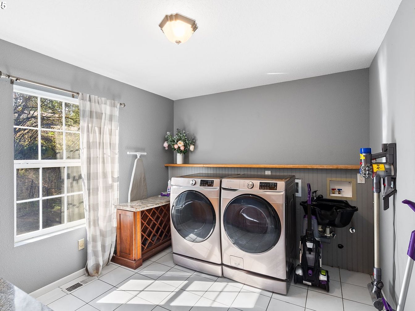 This laundry room blends utility with style, painted in soft gray walls that complement the sleek, silver front-loading washer and dryer set. Natural light pours through a large window dressed with sheer checkered curtains, brightening the space and adding warmth. White tile flooring enhances cleanliness and reflects light. A wooden cabinet with a marble top offers storage and elegant contrast. A simple wooden shelf runs along the wall above appliances for added organization. The space also features a wall-mounted vacuum and a compact black utility sink, balancing function with neat aesthetics.