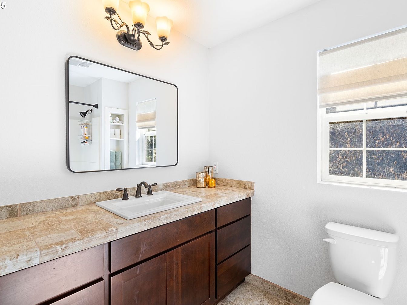 This bathroom features a large vanity with a beige stone countertop paired with rich, dark wood cabinetry that adds warmth and contrast to the predominantly white space. Above the sink, a rectangular mirror with rounded edges is mounted on a pristine white wall, reflecting natural light from the nearby window which has a light beige Roman shade. The bronze faucet and matching three-light fixture above provide elegant, vintage-inspired details. The adjoining white toilet and tiled floor with natural stone hues complement the countertop, creating a cohesive, clean, and inviting aesthetic.