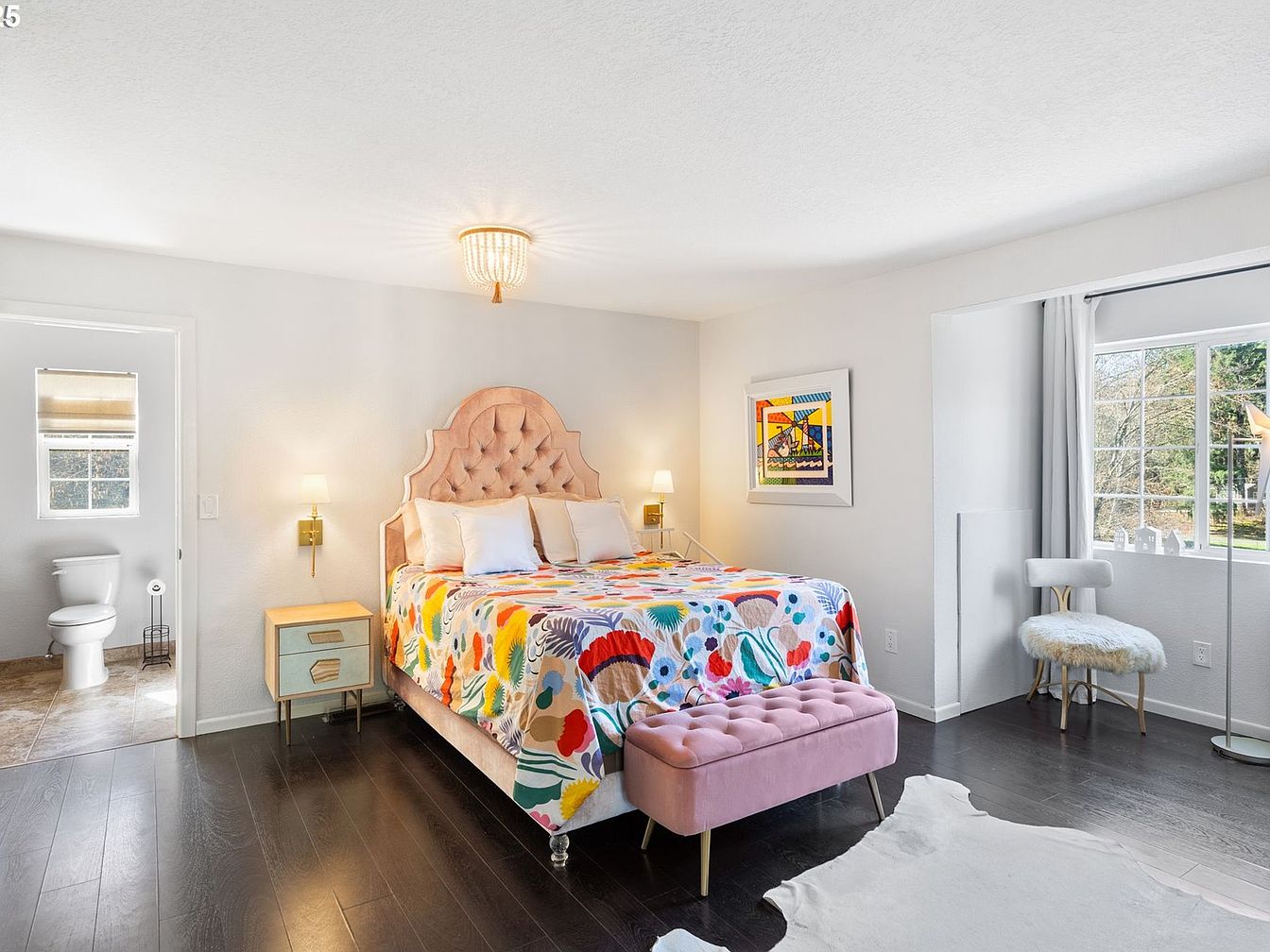 This master bedroom features a harmonious blend of soft and vibrant elements. A plush, tufted pink headboard pairs beautifully with a colorful botanical quilt, adding a lively contrast to the otherwise neutral space. The dark hardwood floors anchor the room, accentuated by a light-colored rug that softens the area. Two wall sconces flank a minimalist nightstand with muted green drawers, offering balanced lighting. A cozy nook by the window includes a furry cushioned chair and floor lamp, perfect for reading. The adjoining bathroom, visible through an open doorway, adds convenience, reinforcing the room’s comfort and functionality.