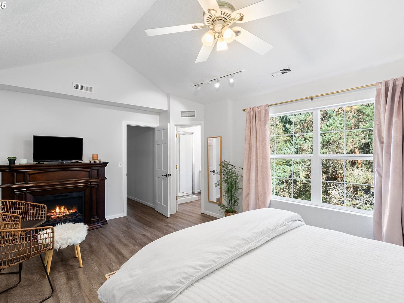 This serene bedroom features vaulted ceilings painted in soft white, enhancing the room’s spacious feel. A large window dressed with light pink curtains invites natural light and offers a view of lush greenery outside. The bed is neatly made with white bedding, contributing to the clean, tranquil atmosphere. Opposite the bed, a rich wooden mantelpiece houses a cozy, lit fireplace, adding warmth and traditional charm. A flat-screen TV sits atop the mantel, balancing modern convenience and classic design. A wicker chair with a fluffy white cushion enhances the cozy corner. Light wood flooring ties the space together, and a full-length mirror near the en suite bathroom door adds functionality and style.