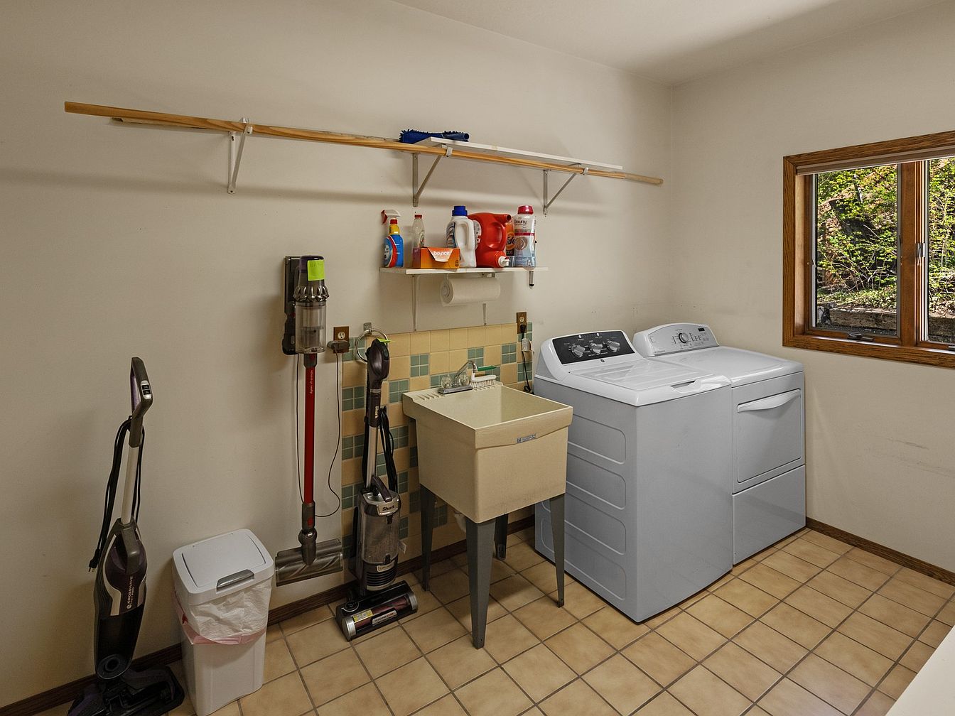 This functional laundry room features a clean and practical layout with a tiled floor in neutral tones, creating a warm and inviting base. The walls are painted a soft off-white, keeping the space bright and uncluttered. A window framed in natural wood trim allows abundant daylight, enhancing the room’s fresh feel and offering an outdoor connection. The appliances include a matching white washer and dryer set, sitting side by side for convenience. Against the wall, a deep utility sink with sturdy metal legs offers versatile washing space, framed by square tiles in muted greens and beige. Above, a minimal wooden shelf and a long hanging rod provide open storage for cleaning supplies and tools, while various vacuum cleaners and a trash bin are neatly placed along one wall. Overall, the room balances functionality and simplicity with subtle vintage touches.
