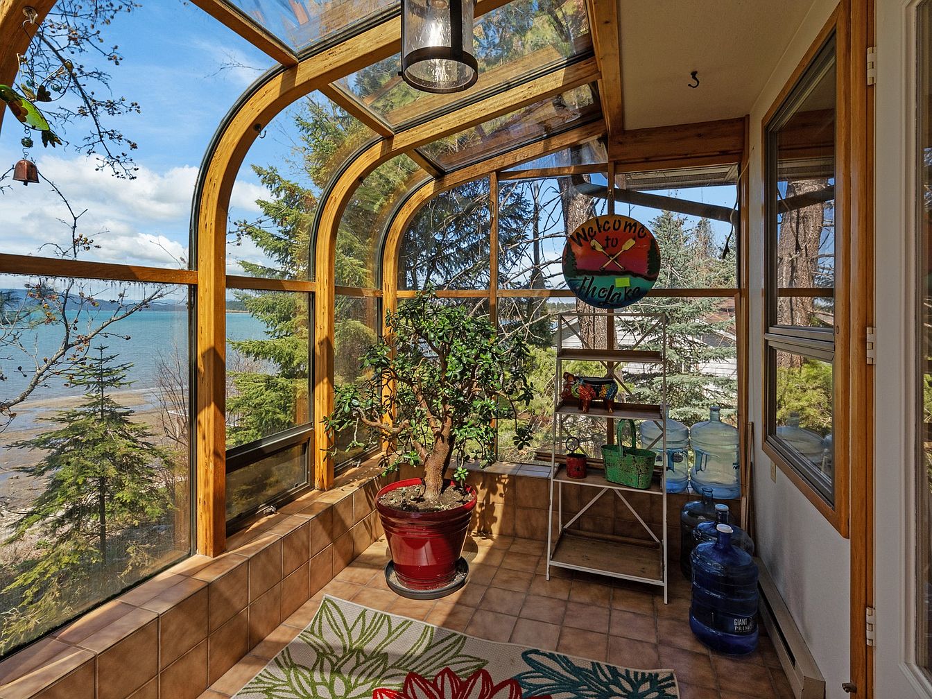 This cozy sunroom features expansive curved glass windows framed in warm wood, allowing panoramic views of the surrounding pine trees and tranquil lake beyond. The light-filled space is accented by earthy terracotta floor tiles and a colorful floral area rug that adds a lively touch. A large potted plant stands prominently, enhancing the connection to nature. A small white metal shelving unit holds decor and essentials, while several water dispensers are neatly arranged along one wall. The natural wood trim and glass ceiling emphasize an airy, inviting atmosphere perfect for relaxation and enjoying the outdoors inside.