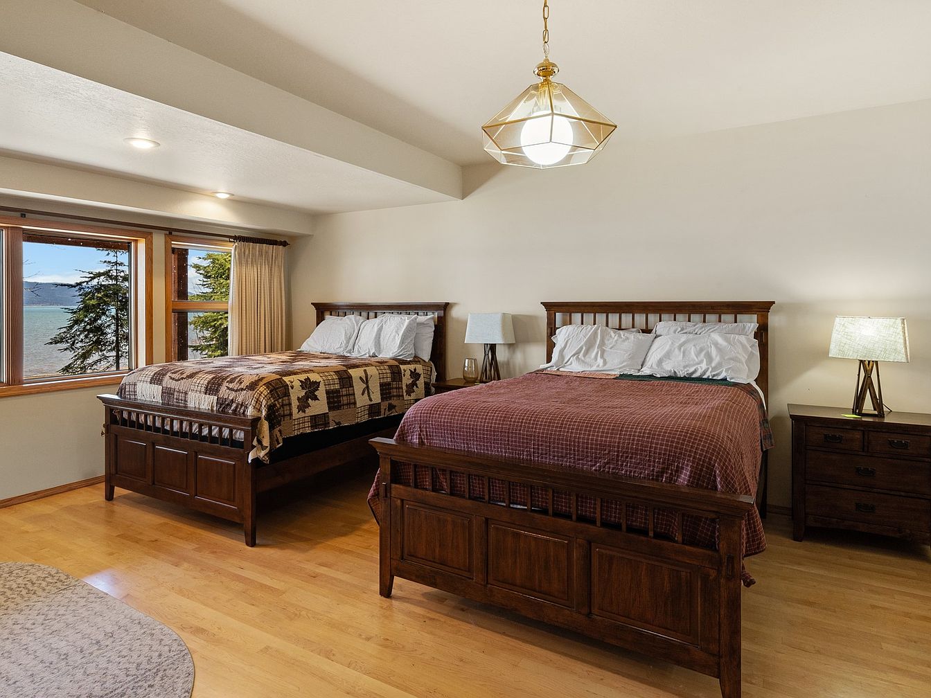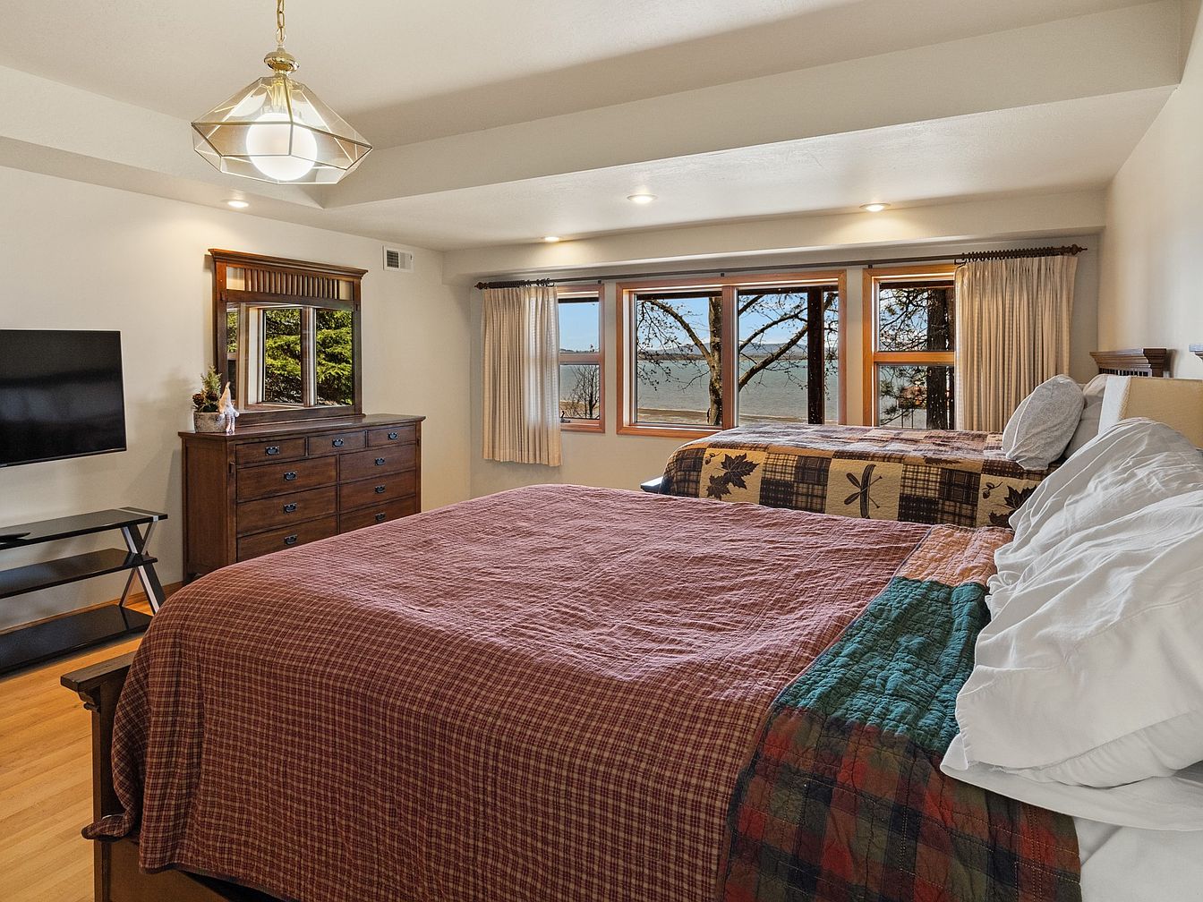 This cozy bedroom features two beds dressed in warm, quilted bedding with earth tones, including shades of rust, green, and beige. A large window spans most of one wall, framed by natural wood trim, offering a breathtaking view of the lake and surrounding trees. The soft cream walls and hardwood floor create a welcoming and calm atmosphere. A dark wood dresser with a matching mirror adds a classic touch, positioned opposite the beds. Lighting is provided by recessed ceiling lights and a central, geometric brass pendant lamp, blending rustic charm with modern comfort.