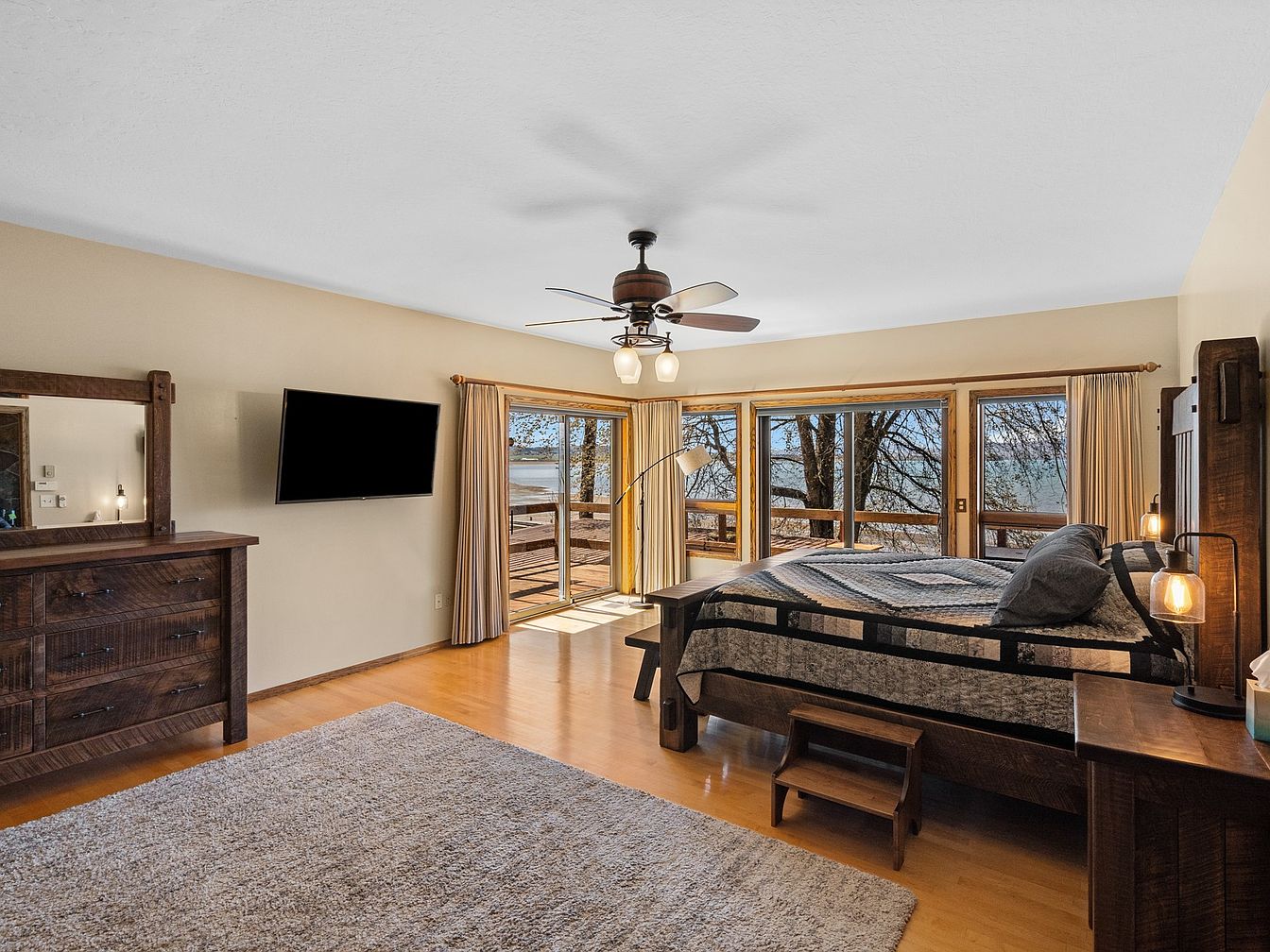 This master bedroom offers a spacious and airy atmosphere enhanced by large floor-to-ceiling windows and sliding glass doors that reveal a serene lake view framed by tall trees. Natural light floods the room, highlighting warm wood tones present in the sturdy bed frame with an artisanal quilt, matching nightstands, and a substantial dresser with a large mirror. Neutral beige walls and curtains complement the honey-colored hardwood flooring and a light textured area rug, creating a cozy yet open feel. A ceiling fan with vintage-style light fixtures hangs centrally, and a mounted flat-screen TV adds modern convenience while maintaining rustic charm.