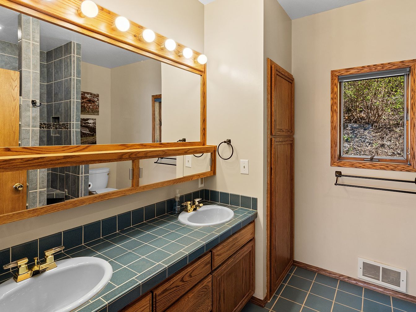 This bathroom features a dual-sink vanity with a rich wood base and blue-green tiled countertop that extends along the length of the wall. Above, a large mirror framed in wood reflects ample light from a row of globe bulbs, adding a warm glow to the space. Neutral beige walls contrast subtly with the tiled surfaces and natural wood accents, including the trim around the window and built-in storage cabinet. A small window brings natural light and a view of greenery outside, while the floor continues the blue-green tile pattern, creating a cohesive and inviting restroom atmosphere.