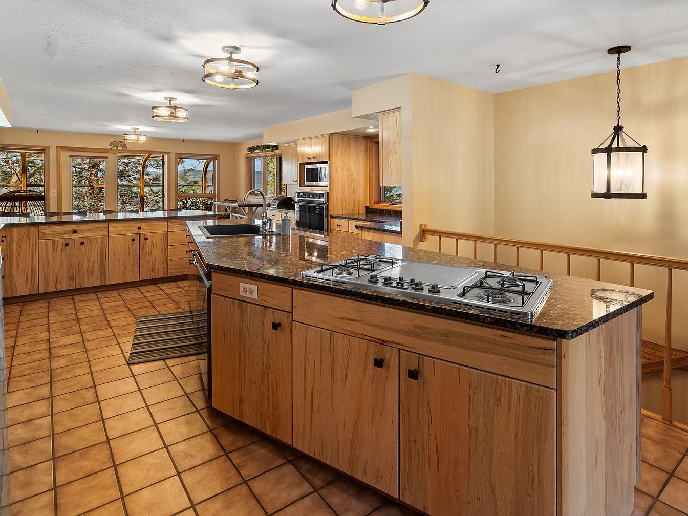 This kitchen features a spacious island with a built-in gas cooktop and a double basin sink, topped with a polished granite countertop that reflects light warmly. The cabinetry is crafted in natural wood with simple black knobs, complementing the earthy terracotta tiled floor. Large windows line one wall, flooding the space with natural light and offering scenic outdoor views, while multiple modern ceiling fixtures provide ample illumination. The soft beige walls and wooden accents create a cozy, inviting atmosphere, while an adjacent stair railing suggests openness and smooth flow between levels in the home.