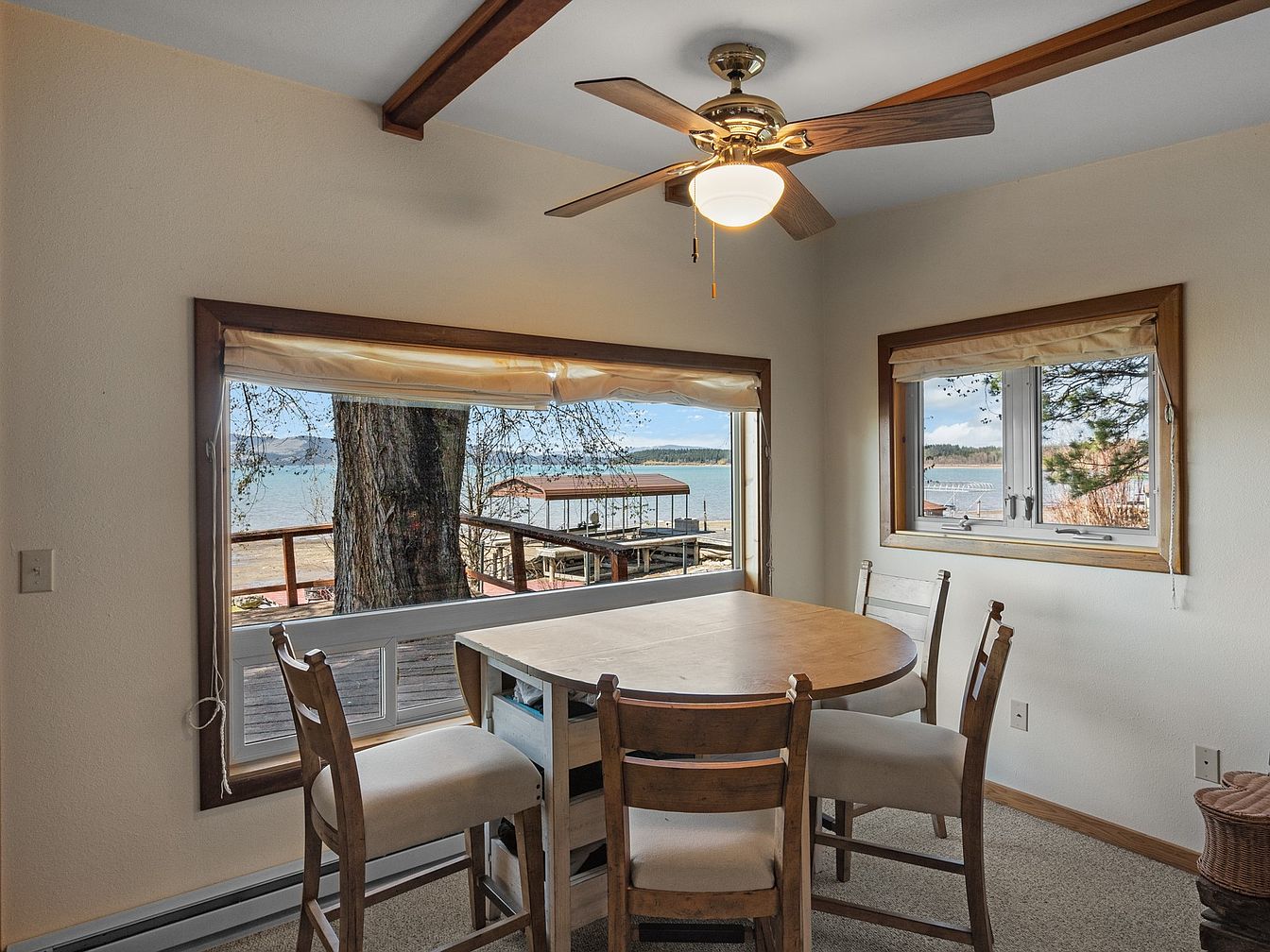 This intimate dining nook is bathed in natural light from two large windows offering serene views of a lakeside dock and lush trees. The space features warm, neutral wall colors complemented by natural wood trim around the windows and a rustic wooden dining table with four cushioned chairs. A ceiling fan with wooden blades and a central light fixture adds to the room’s comfort and functionality. The exposed wooden ceiling beam enhances the cozy, cabin-like atmosphere, while simple beige carpeting grounds the space and invites relaxed, casual meals with a scenic backdrop.