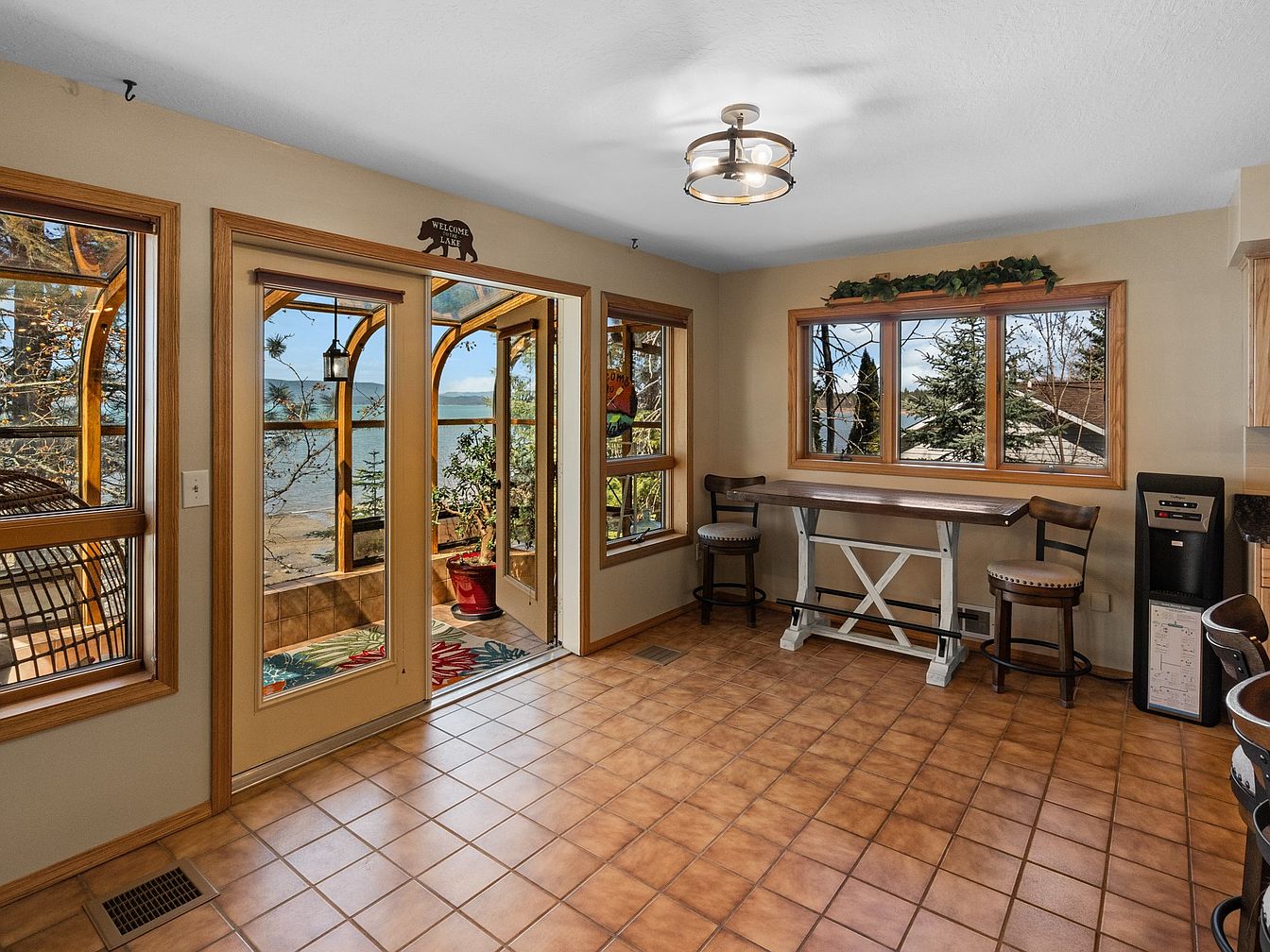 This cozy dining nook features warm terracotta tiled flooring that complements the soft beige walls and natural wood trim around windows and doors. A high, farmhouse-style table with a white base and dark wood top sits adjacent to a large window, offering a lovely view outside. Two cushioned bar stools with dark wood frames and studded upholstery accompany the table, creating an inviting spot for casual meals. French doors with wooden frames open onto a sunroom or enclosed porch with clear glass panels, providing an airy transition to the beautiful lakeside scenery. A simple, modern ceiling light fixture adds subtle style overhead.