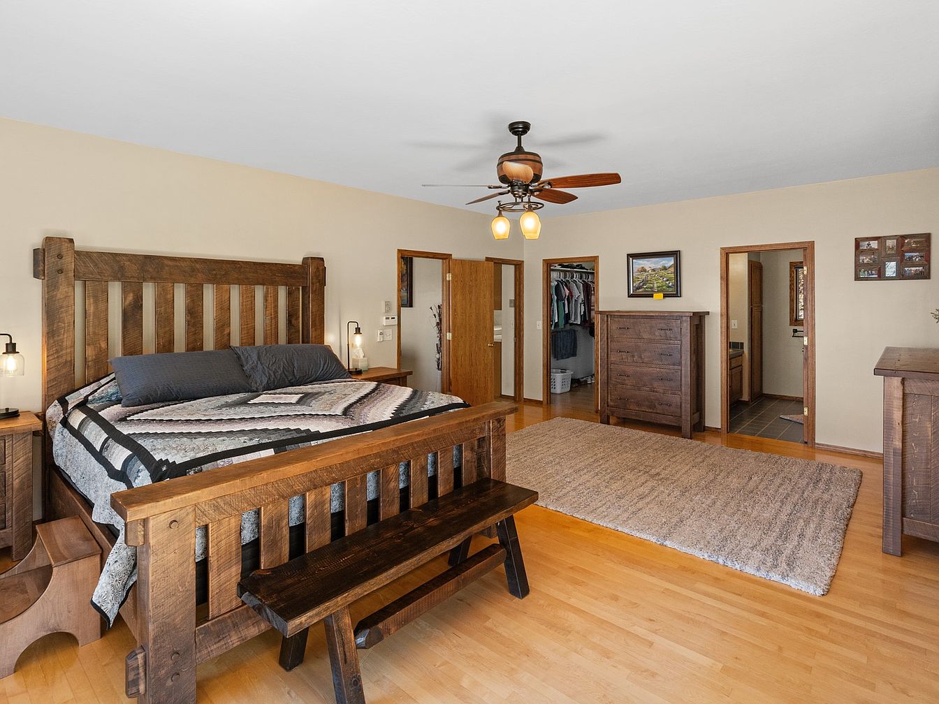This spacious master bedroom showcases sturdy rustic wooden furniture, including a large bed frame with a plank-style headboard and footboard, a matching bench at the foot of the bed, and coordinating bedside tables. The natural wood tones are complemented by a subdued beige wall color and light wood flooring, creating a warm and inviting ambiance. A textured beige area rug anchors the space. Lighting comes from a ceiling fan with three amber glass shades hanging centrally. Doorways on the far wall lead to a walk-in closet and an en suite bathroom, enhancing the room’s functionality and flow.