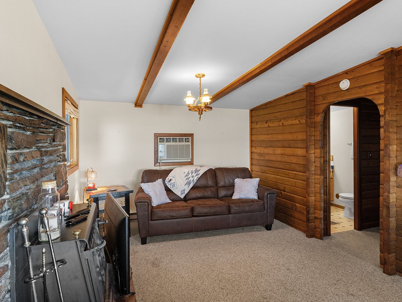 This intimate living space features a blend of rustic and traditional design elements with warm wooden accents throughout. A rich brown leather couch, complemented by soft, pale throw pillows and a patterned throw, anchors the seating area. The walls combine smooth cream paint and natural log cabin-style wood paneling, creating a cozy, inviting atmosphere. Exposed wood-beamed ceiling adds character, while a brass chandelier adds subtle elegance. The stone fireplace with wood-burning stove invites warmth, enhanced by a small side table with a soft glowing lamp. A doorway with an arched wooden frame leads to an adjacent room, suggesting a fluid layout perfect for comfortable living.