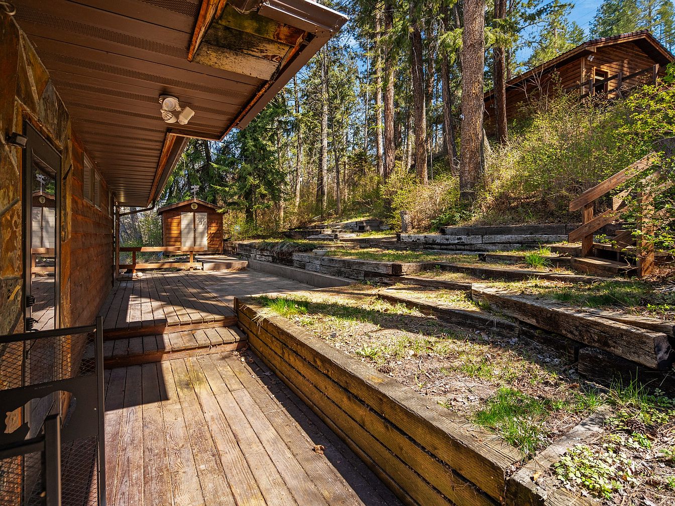 This outdoor space features a rustic wooden deck adjacent to the house, with warm, weathered tones of natural wood extending into terraced garden beds made from large wooden beams. The area gently slopes upward with stone steps embedded in the soil, integrating natural elements into the landscape design. A small detached wooden shed with a pitched roof sits at the back, complementing the cabin-like aesthetic. Tall pine and other trees surround the yard, offering forest ambiance and dappled sunlight that enhances the cozy, earthy charm of this tranquil backyard retreat.