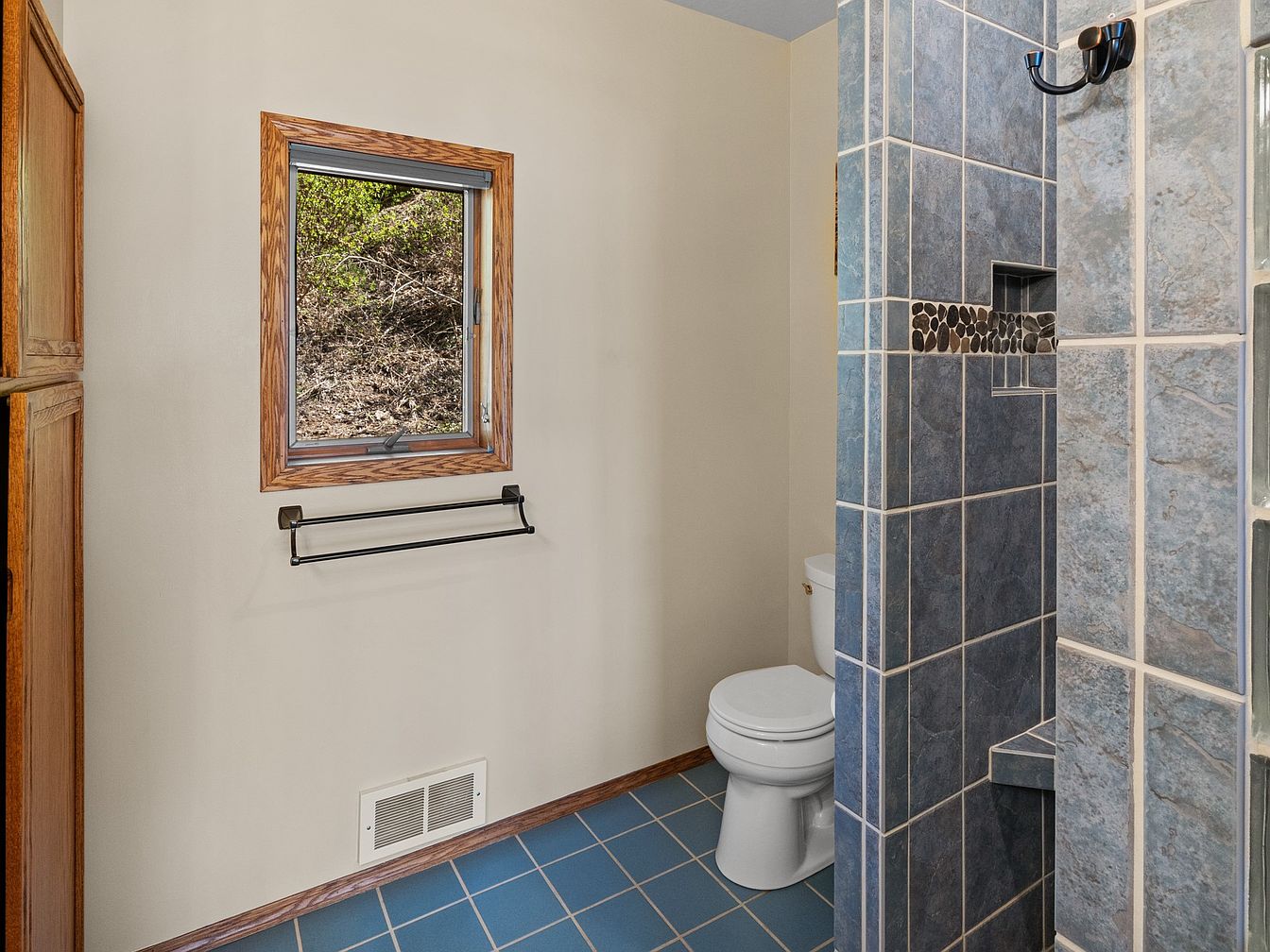 This bathroom features a rustic yet modern design with a soft beige wall color that complements the natural wood trim around the window and cabinet. The focal point is a partially visible walk-in shower, tiled in large slate-blue tiles detailed with a distinctive pebble stone mosaic band, adding texture and visual interest. The shower incorporates built-in niche shelves and a small corner ledge, providing functionality and style. The floor is tiled with coordinating blue squares, tying the space together. A white toilet sits next to the shower, while a black double towel bar adds a contemporary touch beneath the window.