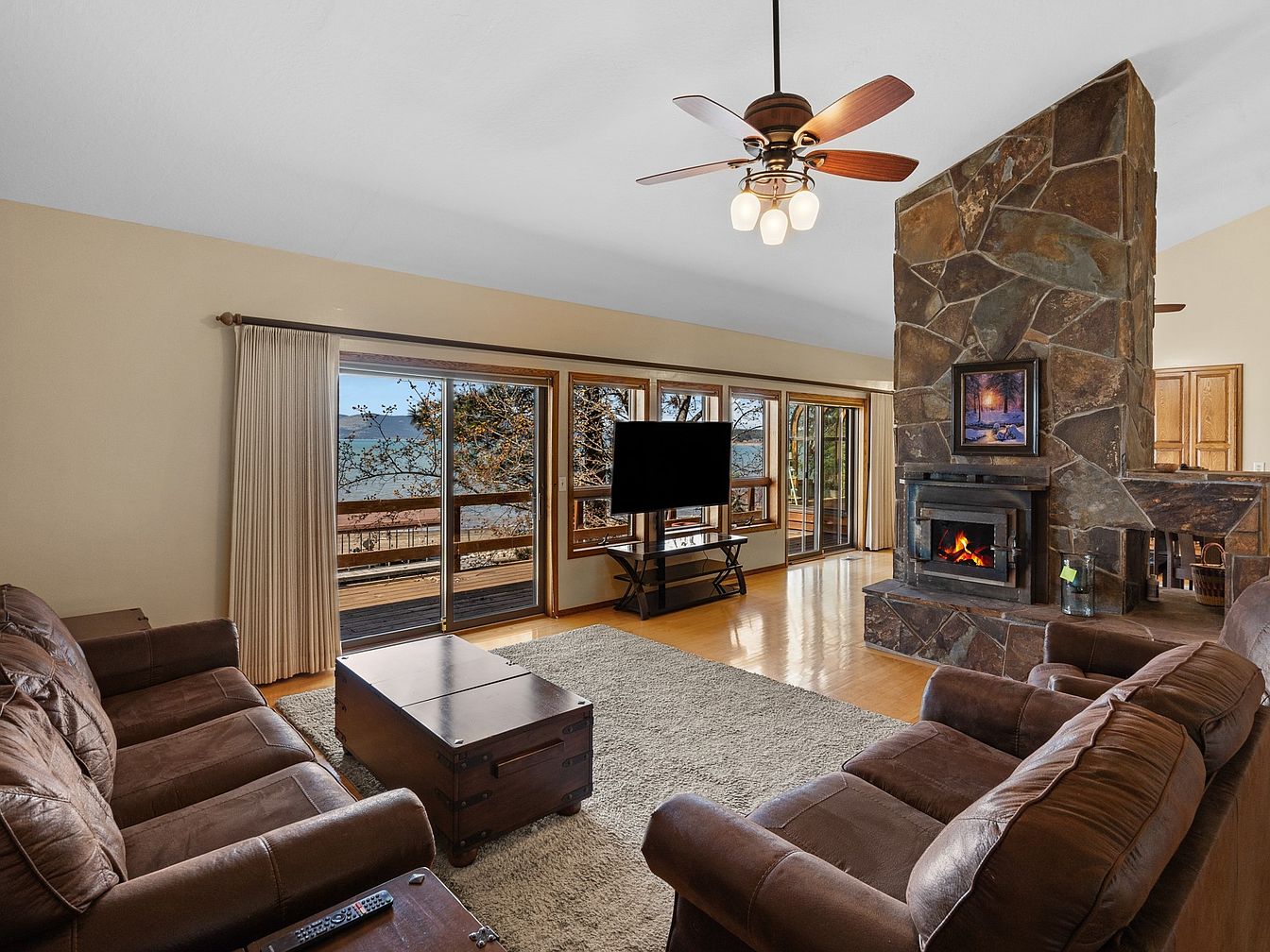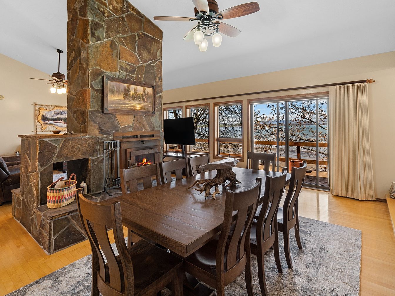 This dining area centers around a large, rustic stone fireplace that adds warmth and grandeur to the space. The wooden dining table and matching chairs feature a dark finish with clean lines, complementing the earthy tones of the stonework. Natural light floods the room through multiple windows and a sliding glass door, providing a scenic view of the water and surrounding foliage. Cream-colored walls and curtains enhance the light atmosphere, while the ceiling fan with light fixtures adds practical charm. The arrangement balances cozy natural materials with open, airy living, perfect for gatherings with a lakeside backdrop.