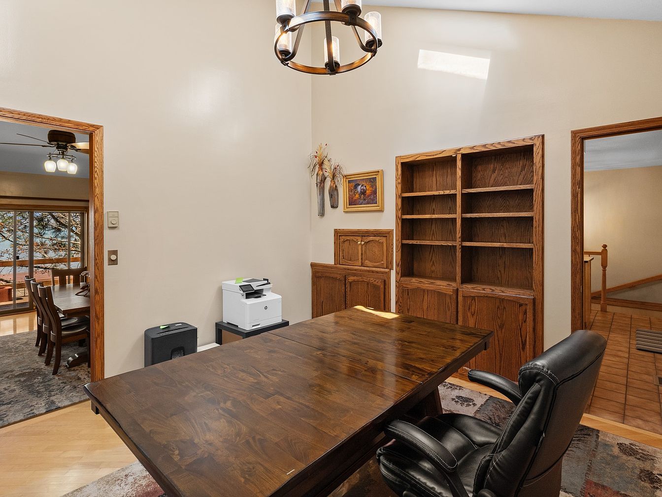This home office features a solid, dark wood desk as its centerpiece, paired with a black leather swivel chair for comfort and professionalism. The walls are painted a neutral beige, providing a calm, inviting atmosphere. Built-in wooden shelves and cabinetry in warm oak tones offer ample storage and display space, while maintaining a cohesive wood theme throughout. A classic chandelier with exposed bulbs hangs from the ceiling, adding a subtle rustic touch. Adjacent rooms, visible through doorways framed in matching wood, hint at a dining area and hallway, integrating the office seamlessly with the rest of the home.
