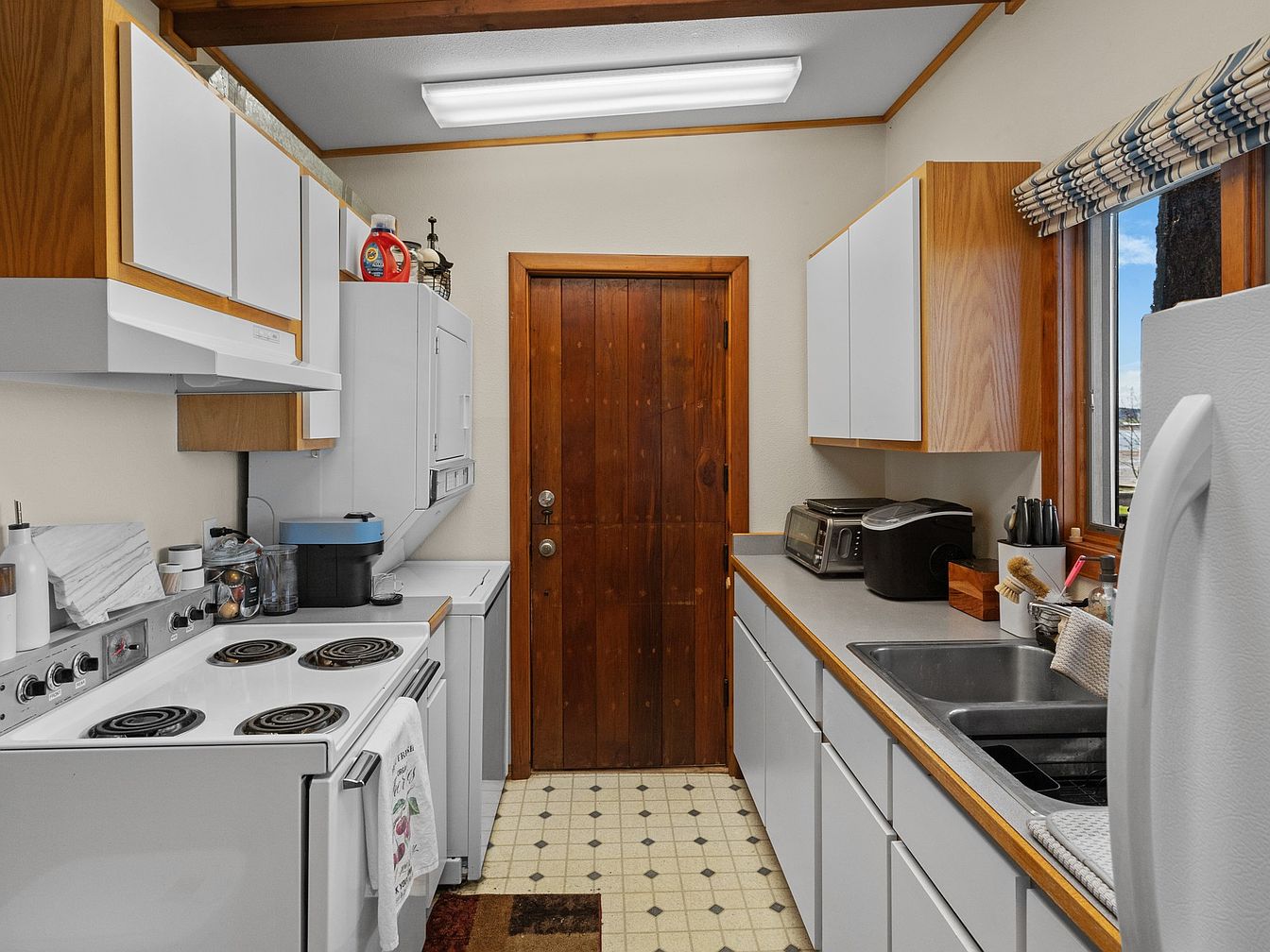 This kitchen combines functionality with efficient use of space, seamlessly integrating laundry appliances to the left of the wooden back door. White cabinetry with light wood trim lines both sides, creating a clean and simple look. The neutral color palette includes soft beige walls and a checkered beige and gray linoleum floor with small dark diamond accents. The counter to the right balances appliances like a toaster oven and rice cooker, while a double stainless steel sink sits beneath a window adorned with a patterned Roman shade. Fluorescent lighting overhead ensures the narrow but practical layout is well-illuminated.