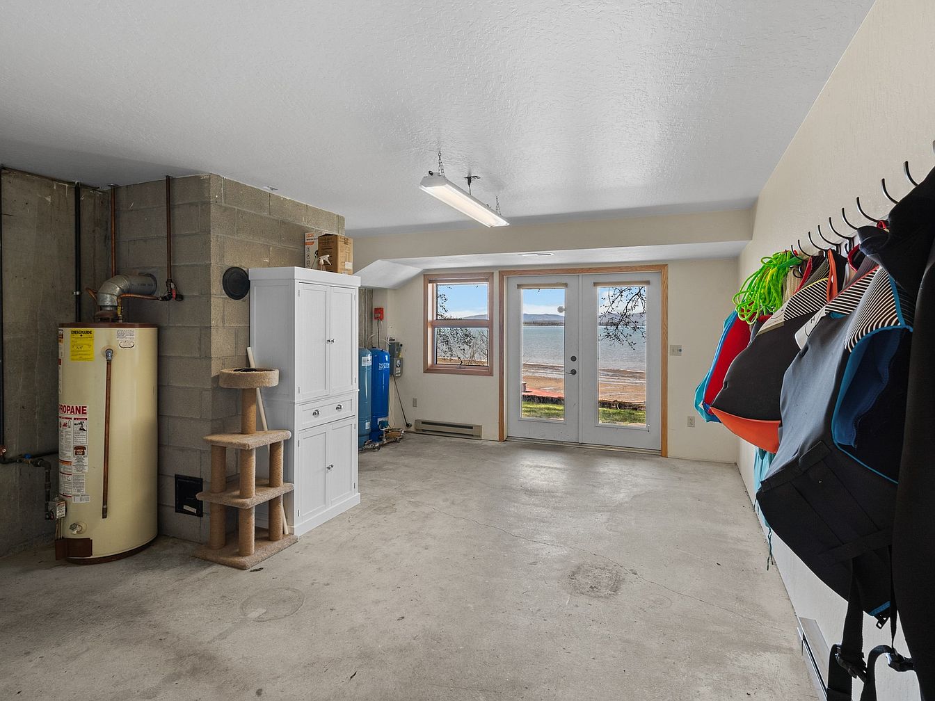 This basement area combines utility with practical storage. A concrete floor and exposed cinder block wall housing the water heater and mechanical systems create an industrial feel. Light cream walls and a clean white ceiling brighten the space. Double glass doors and windows framed in natural wood flood the room with daylight and offer stunning lakeside views. On one side, a white cabinet and a beige cat tree add functional elements, while a row of life jackets hangs neatly on black hooks along the opposite wall, hinting at outdoor and water-related activities.