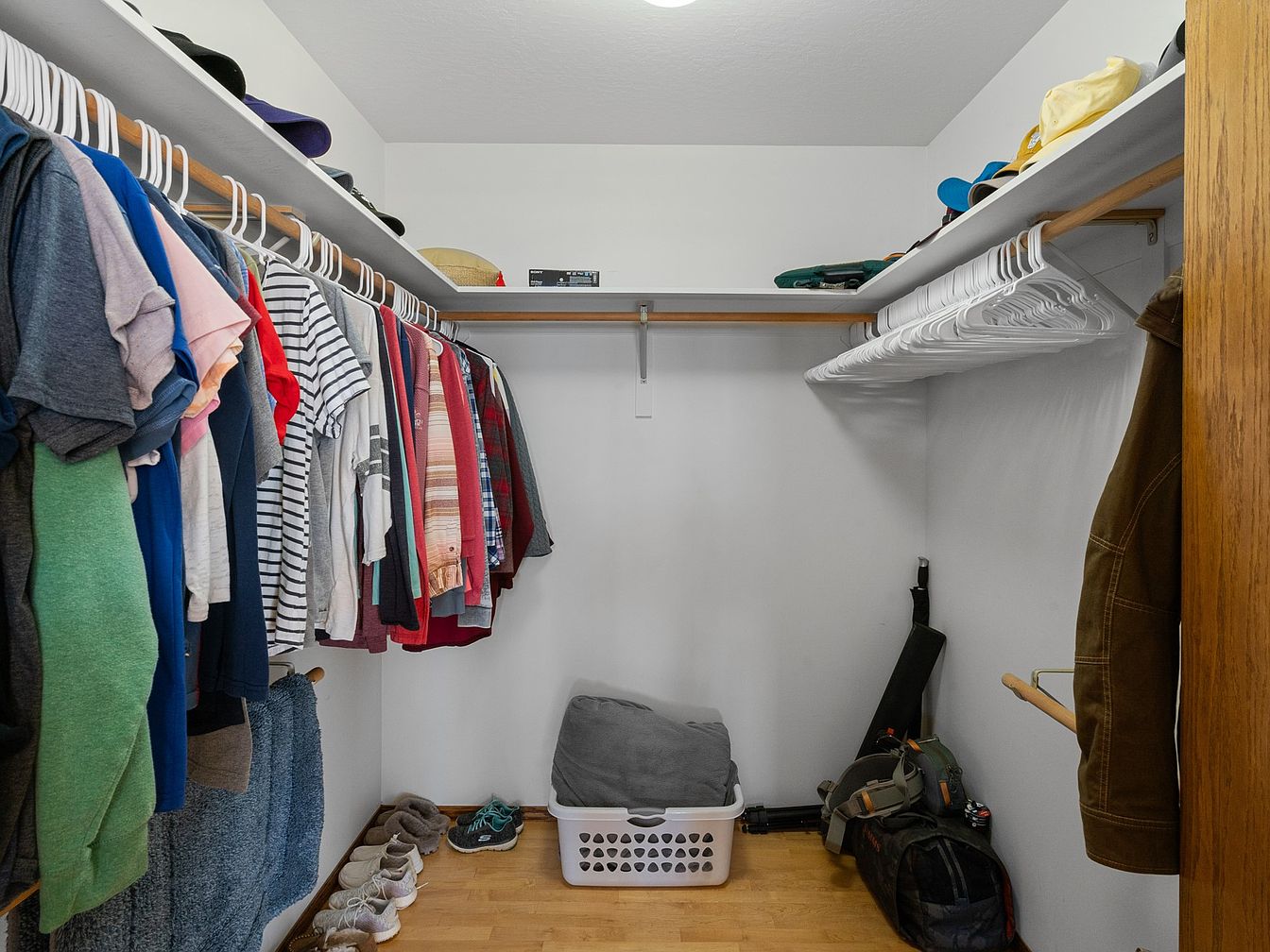 This walk-in closet features a practical and straightforward layout with two long hanging rods on each side, providing ample space for clothing organization. The room is painted crisp white, enhancing the sense of cleanliness and brightness. A wooden floor adds warmth and contrast to the otherwise neutral space. Clothing is neatly hung on white plastic hangers, showcasing a variety of casual wear, while the top shelves hold hats and folded items. On the floor, shoes are lined up neatly, along with accessories and a laundry basket, emphasizing everyday functionality in this compact but efficient storage area.