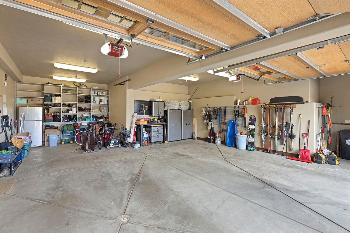 This spacious garage features a practical layout with an emphasis on organization and utility. The concrete floor provides durability, while the walls are painted a neutral beige, creating a calm backdrop for the storage solutions. On one side, open shelving units and closed cabinets hold various tools, containers, and sports equipment, including bikes and outdoor gear. A refrigerator fits neatly among the storage, enhancing convenience. Ski equipment and other outdoor tools hang neatly on wall-mounted racks and pegboards to maximize space. Overhead fluorescent lights ensure the area is well-lit, making it a highly functional and efficient workspace.
