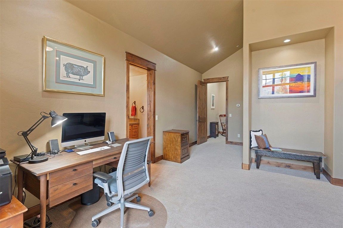 This spacious bedroom features a vaulted ceiling with a sleek ceiling fan, enhancing air circulation. Two built-in bunk beds with beadboard paneling and black framing offer a practical sleeping arrangement, perfect for a shared room or guest accommodation. Adjacent to the beds, a comfortable gray sofa sits beneath large, grid-paned windows that frame a scenic mountain view, filling the room with natural light. A modern workstation opposite the sofa includes a wooden desk, ergonomic chair, computer, and a small lamp, creating a functional home office corner. Neutral beige walls and carpet unify the warm, inviting atmosphere.