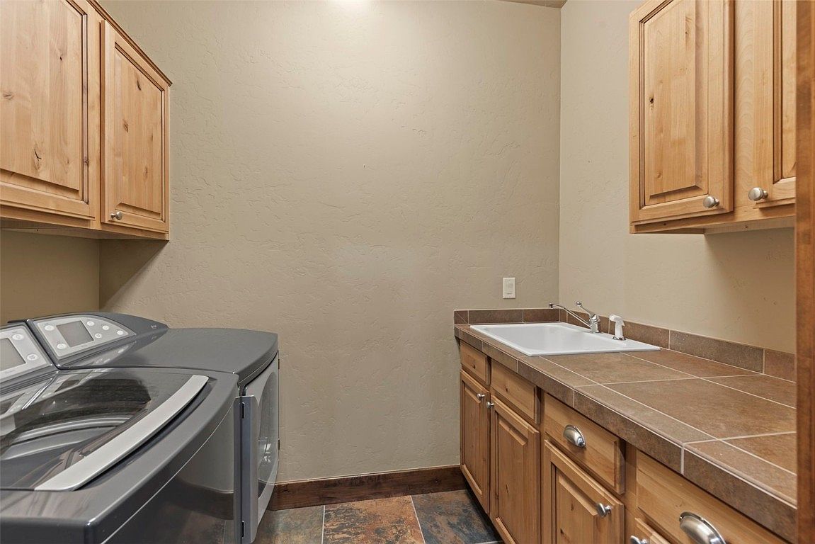 This laundry room features an efficient, clean layout with a washing machine and dryer positioned side-by-side on the left. Opposite, a long countertop with brown tile surface offers ample folding space and incorporates a deep white utility sink with a sleek faucet. Surrounding the countertop are natural wood cabinets in a warm, honey finish, providing generous storage both above and below. The flooring complements the cabinetry with a similar earthy tone, and beige walls with slight texture add subtle contrast while maintaining a neutral, welcoming atmosphere perfect for household chores.
