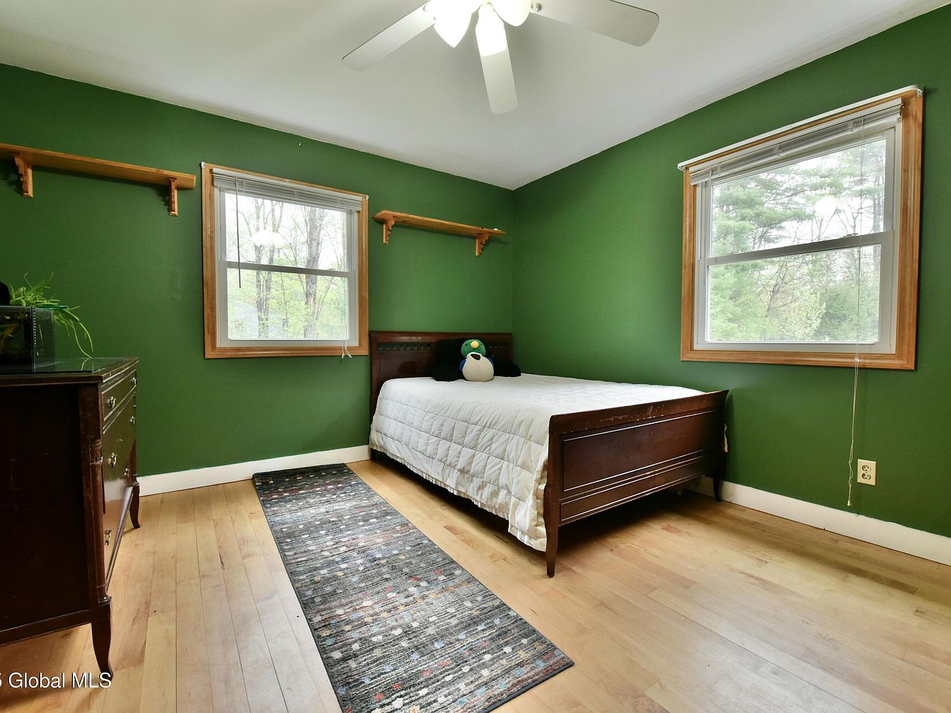 This inviting bedroom features deep green walls that create a serene and grounding atmosphere. Two windows framed with natural wood trim allow ample natural light to brighten the space, complementing the light hardwood flooring. A wooden bed with a white quilt provides a tasteful contrast against the green walls, while a plush penguin cushion adds a playful touch. Adjacent to the bed is a vintage wooden dresser and two simple wood shelves mounted on the walls, offering functional storage and display space. A patterned runner rug directs attention along the room’s length, enhancing warmth and texture. Overhead, a white ceiling fan ensures comfort and airflow.