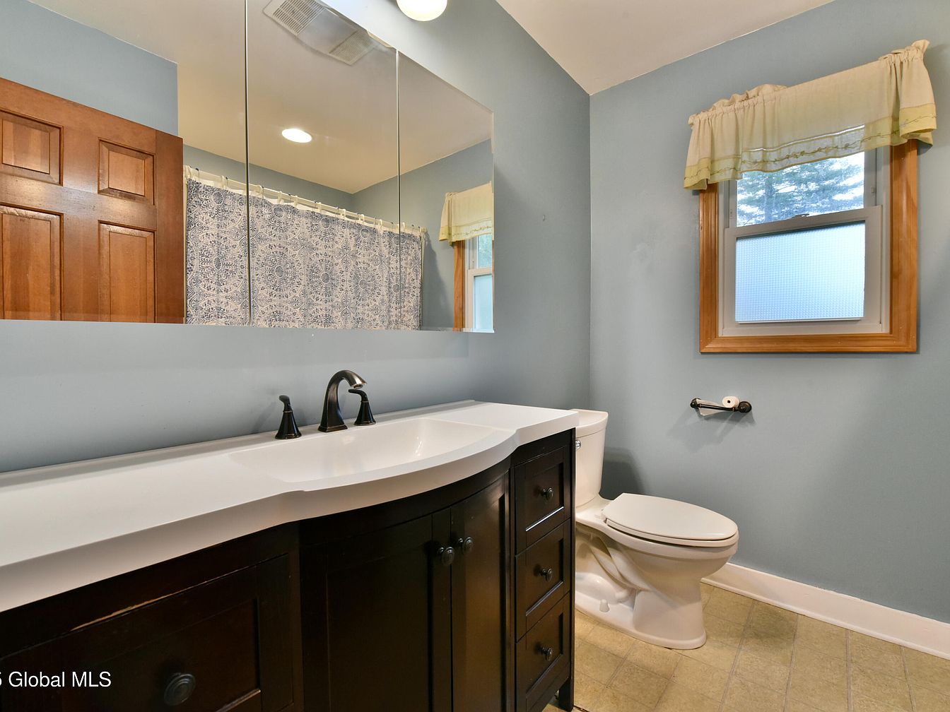 This bathroom blends practicality with classic design, featuring soft blue walls that create a calming atmosphere. A dark wood vanity with multiple drawers supports a sleek white countertop, enhanced by a modern black faucet. Above the vanity, a large mirror with three panels effectively opens up the space while reflecting overhead recessed lighting. The white toilet is positioned beside a wood-trimmed window that has a frosted lower pane for privacy, topped with a simple cream-colored valance. A patterned blue and white shower curtain adds subtle visual interest near the wooden entry door, contrasting gently with the overall muted palette.