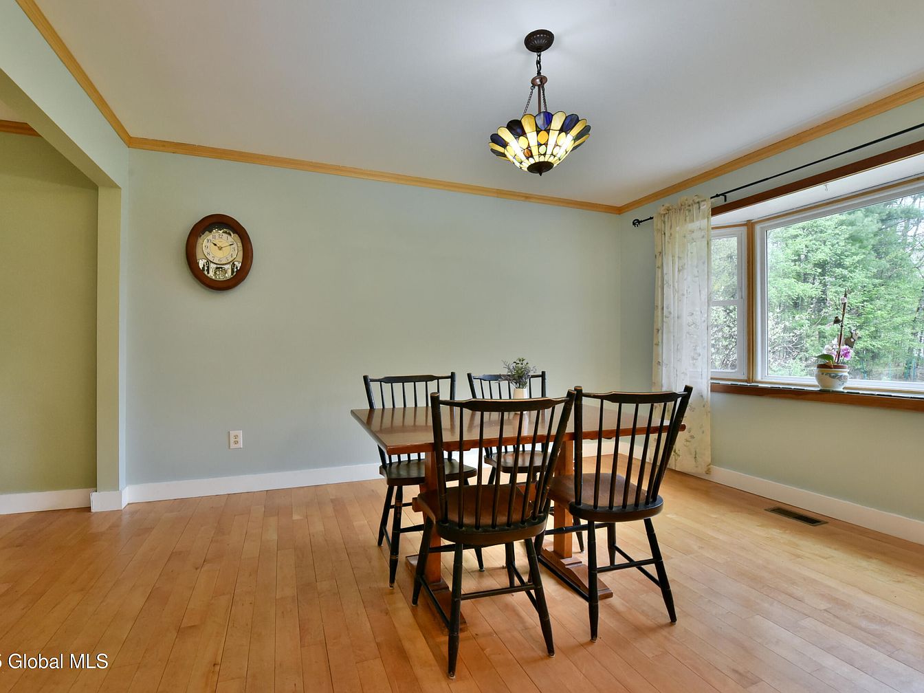 This dining area features a warm and inviting space accentuated by honey-toned hardwood floors that complement the soft pastel wall colors framed with light wood crown molding. A medium-sized wooden dining table sits centrally, surrounded by five black spindle-back chairs, offering a classic contrast. Natural light floods in from a large bay window adorned with sheer curtains, enhancing the airy atmosphere and providing scenic views of greenery outside. The space is gently illuminated by a vintage stained-glass pendant light, adding character and a touch of artful glazing to the otherwise minimalist design.