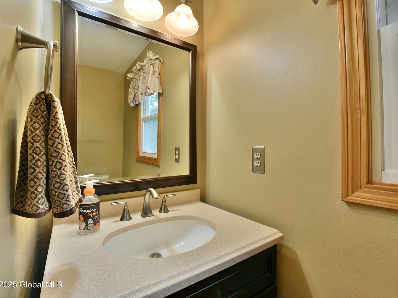 This bathroom vanity area features a compact yet functional design with warm beige walls complemented by a cream-colored solid surface countertop. A large, rectangular mirror framed in dark wood stretches across the wall, reflecting light from two overhead frosted glass fixtures that add softness to the space. Below the countertop, dark cabinetry offers storage contrast and depth against the lighter surfaces. A metal towel ring holds a textured hand towel in earth tones, while a seasonal soap dispenser sits neatly beside the sink. Natural wood trim frames a small window fitted with a floral valance, introducing a cozy, traditional touch.