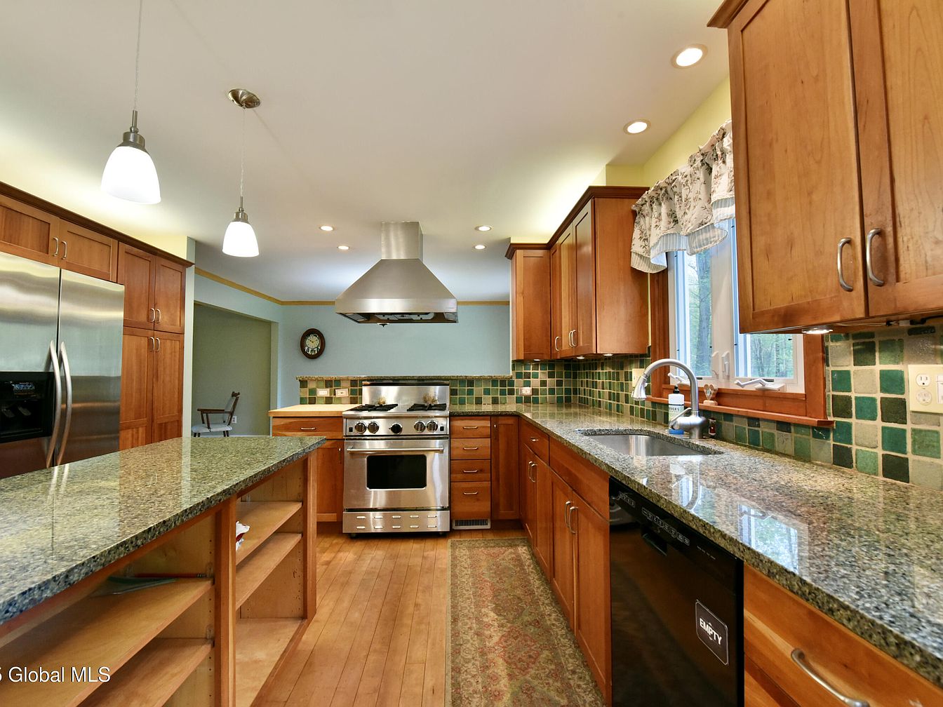 This kitchen presents a warm, inviting design highlighted by its natural wood cabinetry, which contrasts beautifully with the cool green tiled backsplash. Granite countertops extend along both the main prep areas and the large central island, offering ample space for cooking and entertaining. The stainless steel appliances, including a prominent range and fridge, add modern functionality, while open shelving on the island provides accessible storage. Soft pendant lights above the island complement recessed ceiling lighting, ensuring a bright workspace. A patterned runner rug softens the wood flooring, and flourished window curtains add a subtle traditional touch to the well-appointed space.