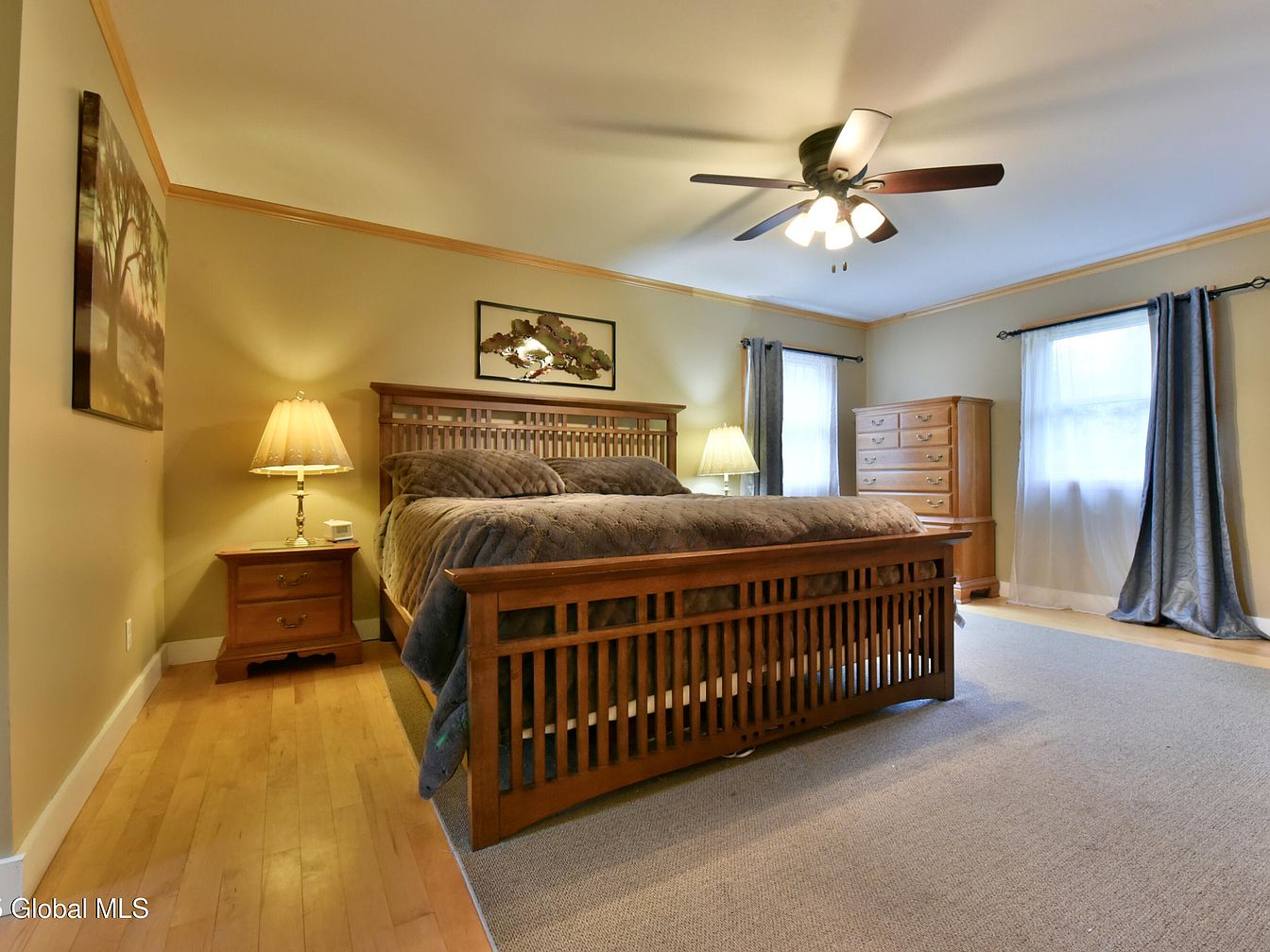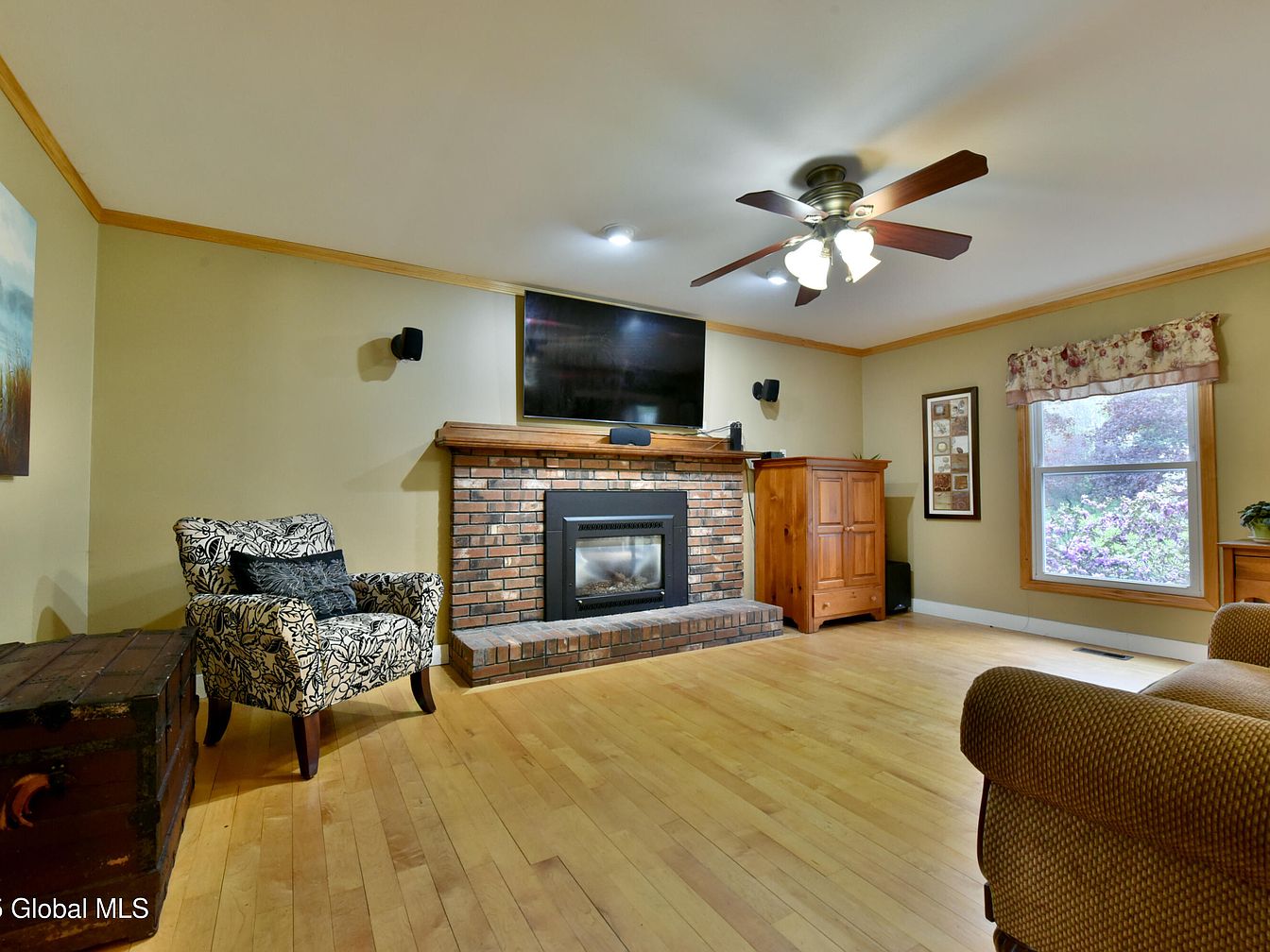 This charming home is a classic colonial-style residence located in Saratoga Springs, NY, set on a spacious 1.18-acre plot. The house offers 4 bedrooms and 2 1/2 bathrooms, providing ample living space with hardwood floors throughout. The semi-open floor plan features a cozy gas fireplace with a traditional brick surround, adding warmth and character to the living area. The kitchen is well-equipped with stainless steel appliances, including a commercial-inspired gas range topped with an attractive island hood. It conveniently connects to the adjacent dining room and includes counter seating for casual dining. The generous outdoor space invites endless possibilities for creating a personalized backyard oasis. Additionally, the property includes an oversized two-story shed with a versatile loft area suitable for storage or other uses. Situated within Saratoga Springs School District and offering a Saratoga Springs mailing address, this home benefits from low Witon taxes. Priced at $540,000, this residence provides a perfect blend of comfort, functionality, and customization potential to fit various lifestyles.