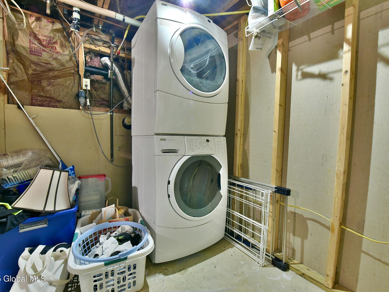 This basement laundry area features a stacked washer and dryer positioned neatly against an unfinished wall with exposed wooden studs and insulation. The concrete floor emphasizes the utilitarian nature of the space. To the left, various storage bins and laundry baskets suggest functional organization, while a small drying rack leans against the wall to the right. The visible piping and electrical wiring above enhance the raw, industrial feel. Despite its unfinished state, the space is practical and equipped to handle household laundry needs efficiently.