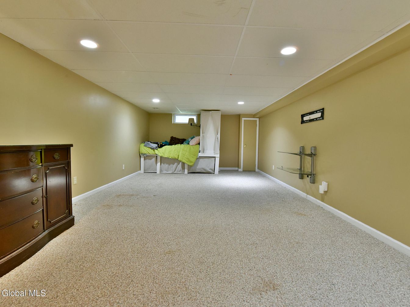 This basement living area features a warm beige wall color complemented by a textured light beige carpet that extends throughout the space. The ceiling is a white drop ceiling with recessed lighting fixtures providing ample illumination. Along one wall, a classic dark wood dresser adds traditional charm, balancing out the room’s otherwise modern simplicity. On the opposite wall, mounted glass shelves with silver hardware offer minimalistic display options. At the far end, a built-in bench or nook with bright green bedding and plush pillows hints at a cozy resting spot while a small window near the ceiling lets in natural light, subtly brightening the space. The overall feel here is casual and functional, ideal for a flexible recreational or relaxation zone.