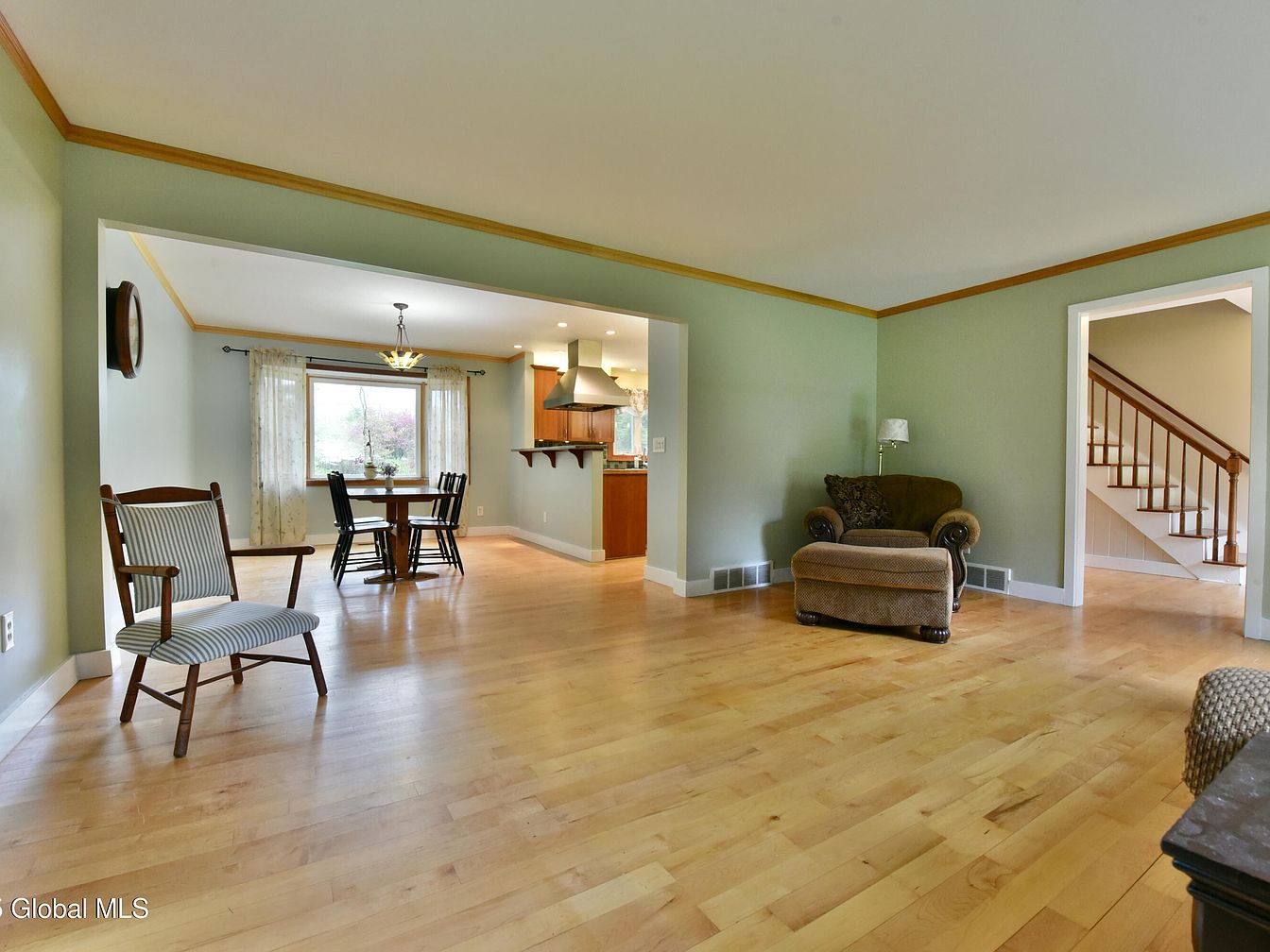 This open-concept space connects the living room and dining area, enhancing the home’s flow. Soft green walls with honey-toned wood trim complement the warm, light-colored hardwood floors, creating a cozy yet airy atmosphere. In the living area, a plush, earth-toned armchair with an adjacent lamp invites relaxation. A wooden armchair with striped upholstery adds charm near the dining space. The dining area features a round wooden table with four black chairs, framed by a large window dressed with sheer floral curtains that allow natural light. Beyond, the kitchen is partially visible, featuring wood cabinetry and a stainless steel range hood, adding modern functionality.