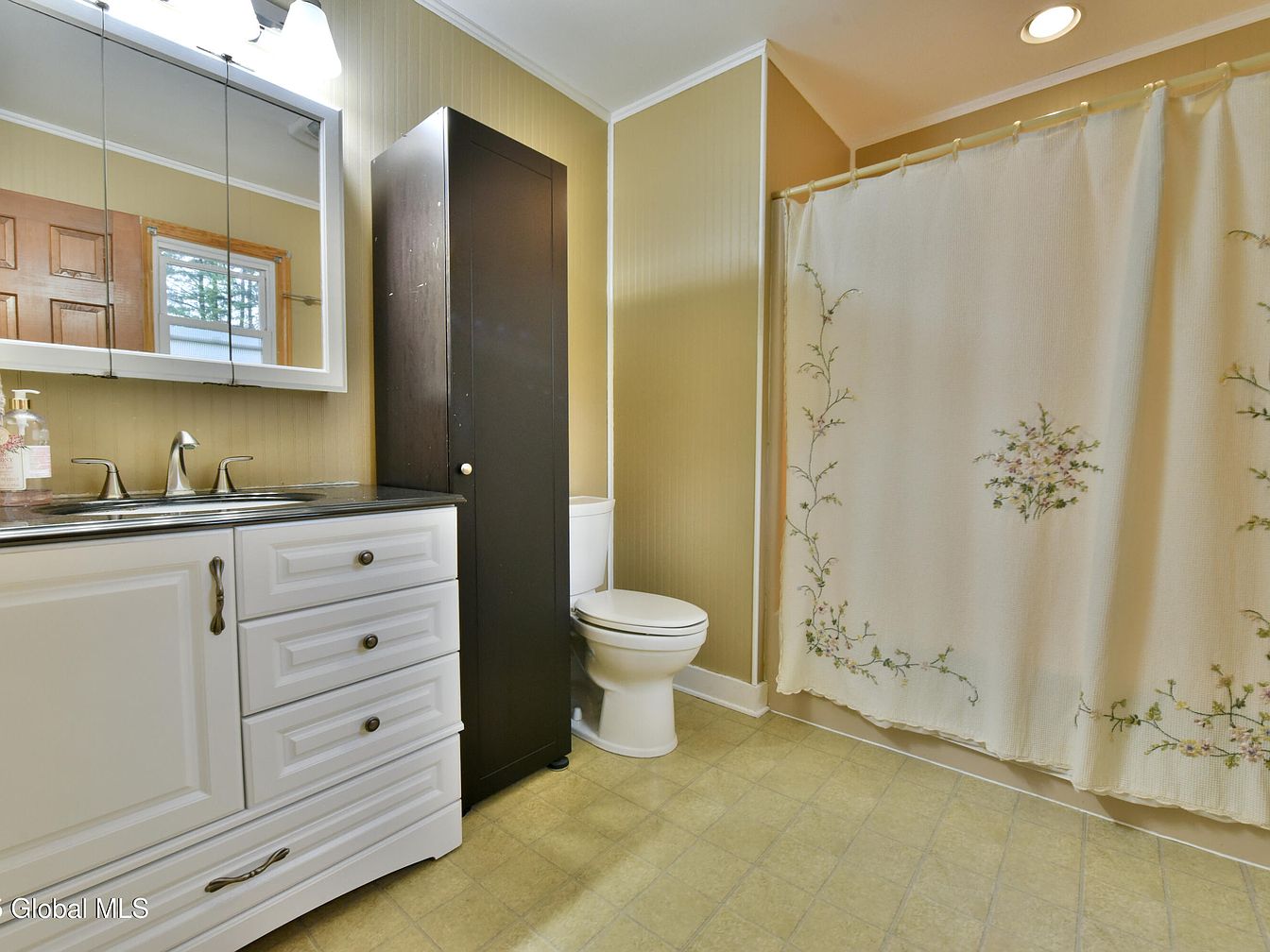 This bathroom features a functional and cozy layout with a combination of traditional and neutral tones. A white vanity with detailed drawers and bronze knobs supports a sleek black countertop with a built-in silver faucet. Above the vanity, a large mirror is framed in white, reflecting ample light from a wall sconce. Adjacent to the vanity stands a tall, dark brown cabinet providing additional storage next to a white toilet. The walls are paneled in beige, complementing the soft yellow-green tiled floor. A cream-colored shower curtain adorned with delicate floral embroidery adds a charming, subtle decorative touch to the space.